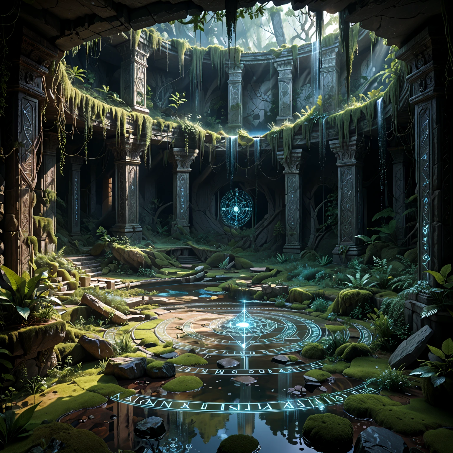 moss_sanctum_interior, overgrown, ruins, runes, magic circle, plant, indoor, forest, water, pools, scenery