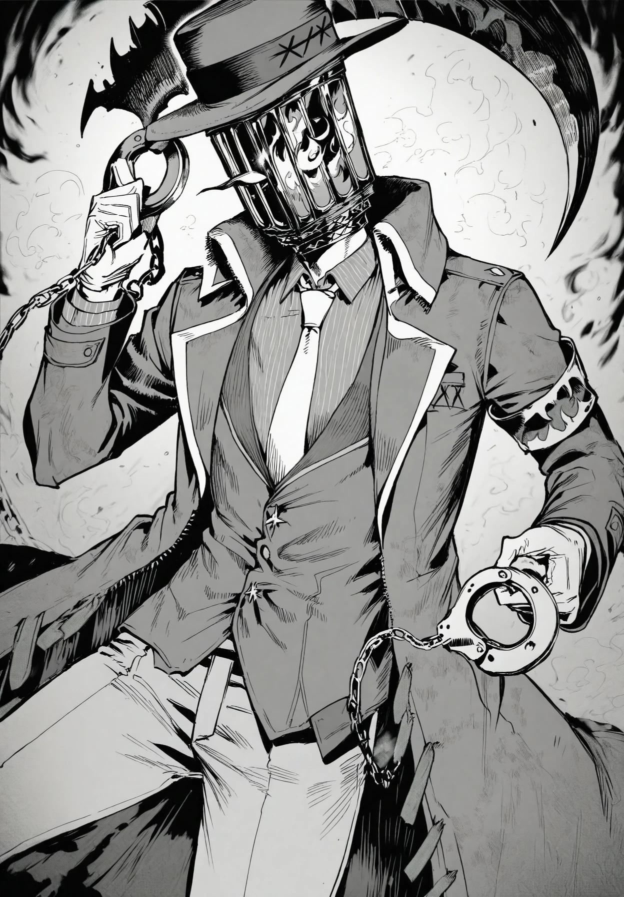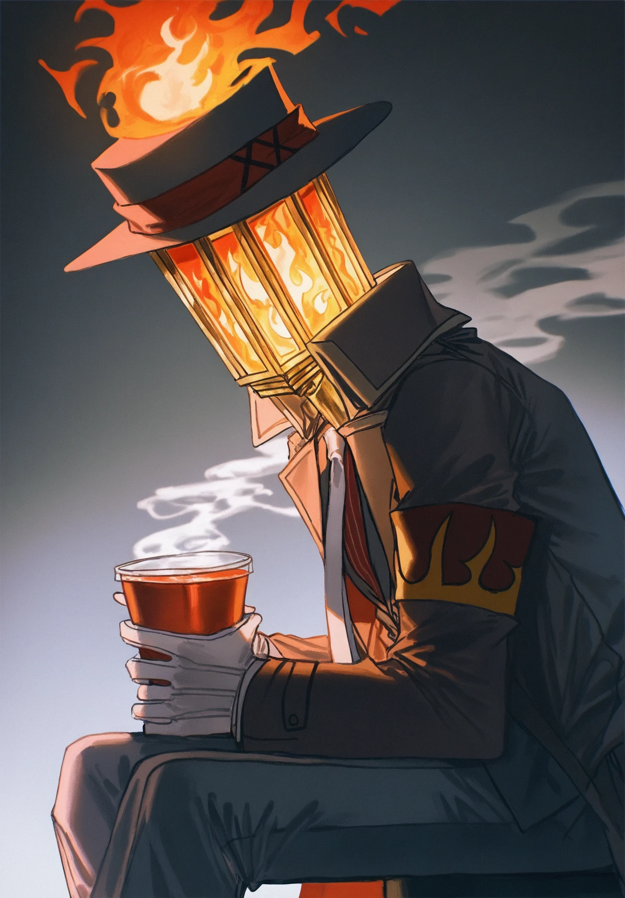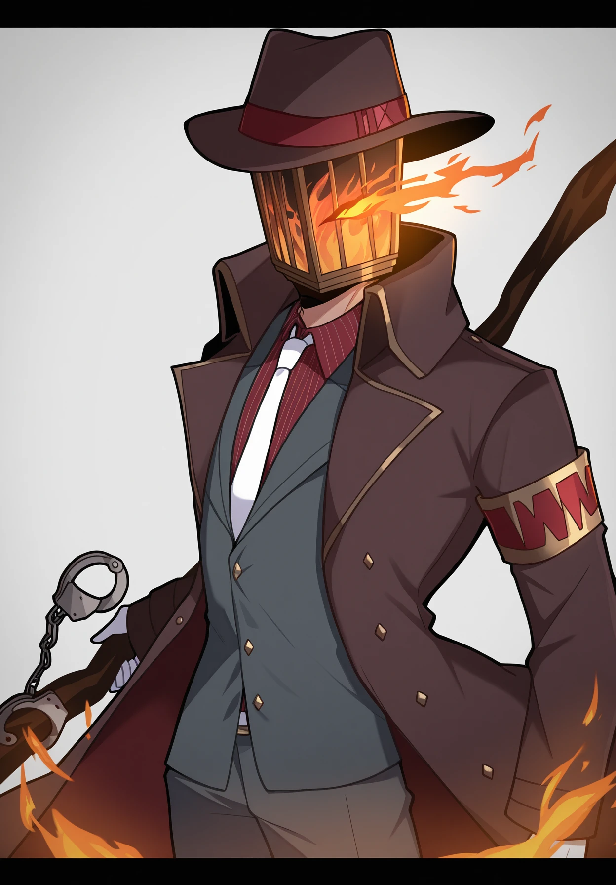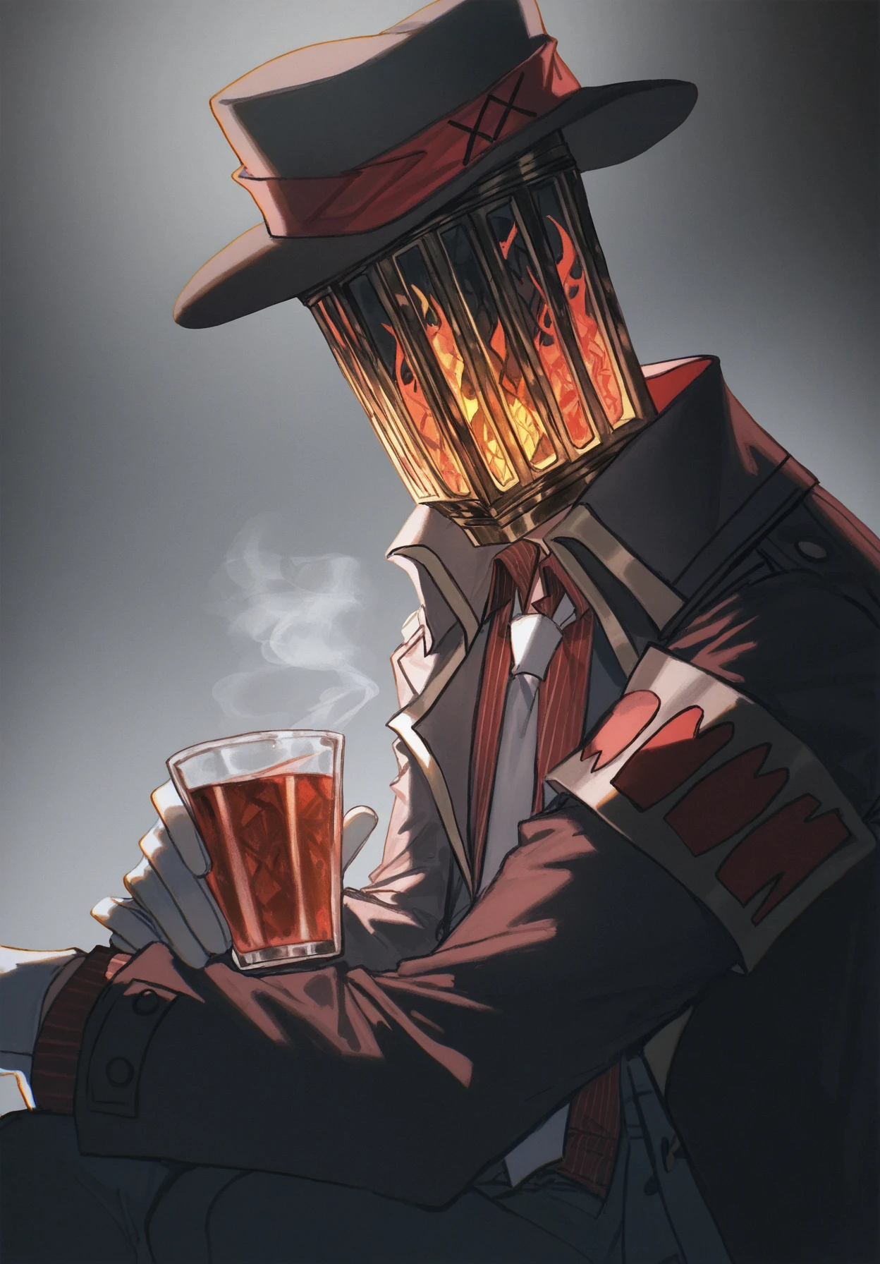 ignis,1boy,lamppost head,fedora,white necktie,grey coat,grey jacket,red armband,white gloves,jacket under coat,,red shirt,vertical-striped shirt,grey pants,dress shoes,black shoes,