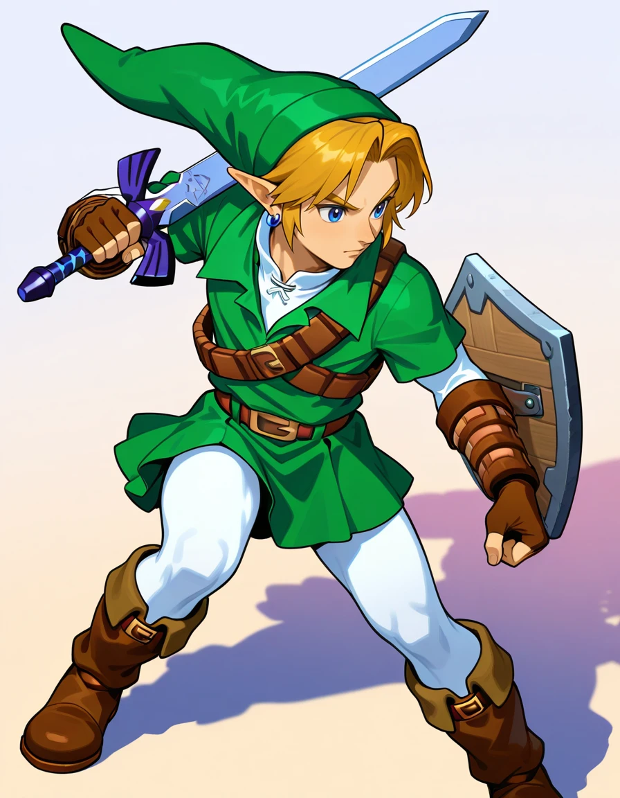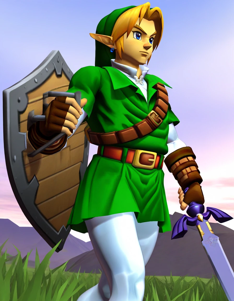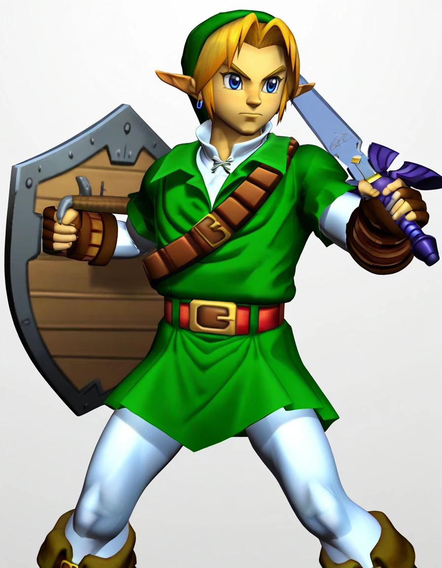 meleelink, 3d, 1boy, link, the legend of zelda: ocarina of time, solo, male focus, white pantyhose, white undershirt, collared shirt, layered sleeves, green tunic, green headwear, green pleated skirt, shoulder belt, blue eyes, blue hoop earrings, blonde hair, brown fingerless gloves, brown elbow gloves, brown knee boots, left-handed, holding sword, master sword, holding shield, masterpiece, best quality, absurdres, very aesthetic, <lora:meleelink:1>Description