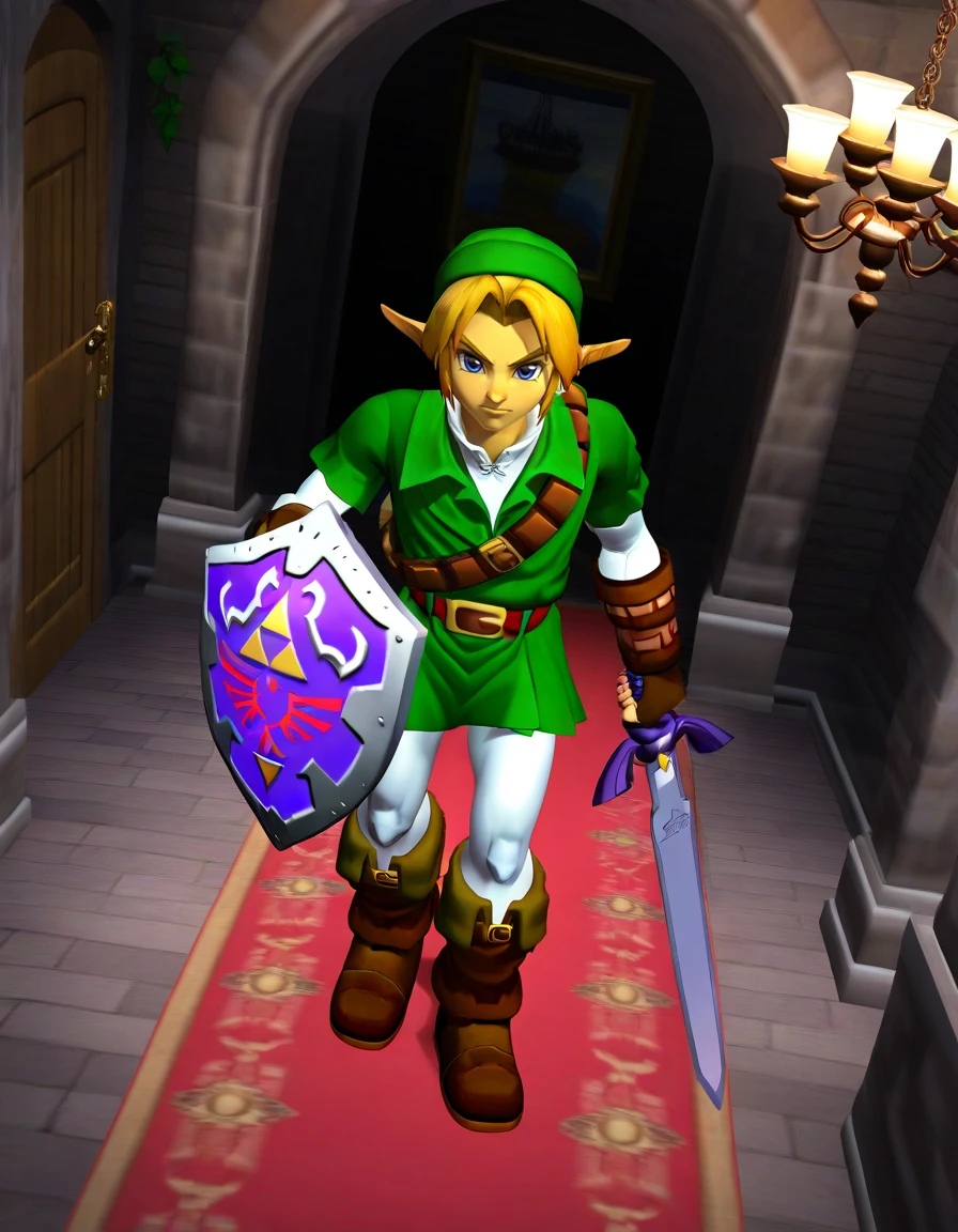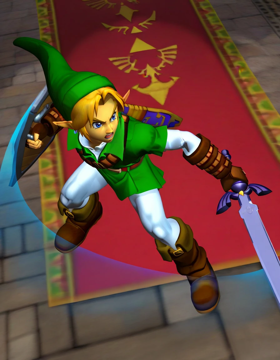 meleelink, 3d, 1boy, link, the legend of zelda: ocarina of time, solo, male focus, holding sword, master sword, long sword, holding shield, white pantyhose, white undershirt, collared shirt, layered sleeves, green tunic, green headwear, green skirt, pleated skirt, shoulder belt, hoop earrings, blue earrings, brown gloves, fingerless gloves, elbow gloves, brown boots, knee boots, masterpiece, best quality, absurdres, very aesthetic, <lora:meleelink2:1>"hylian shield" is supported but the chance of getting a good image becomes even smaller.