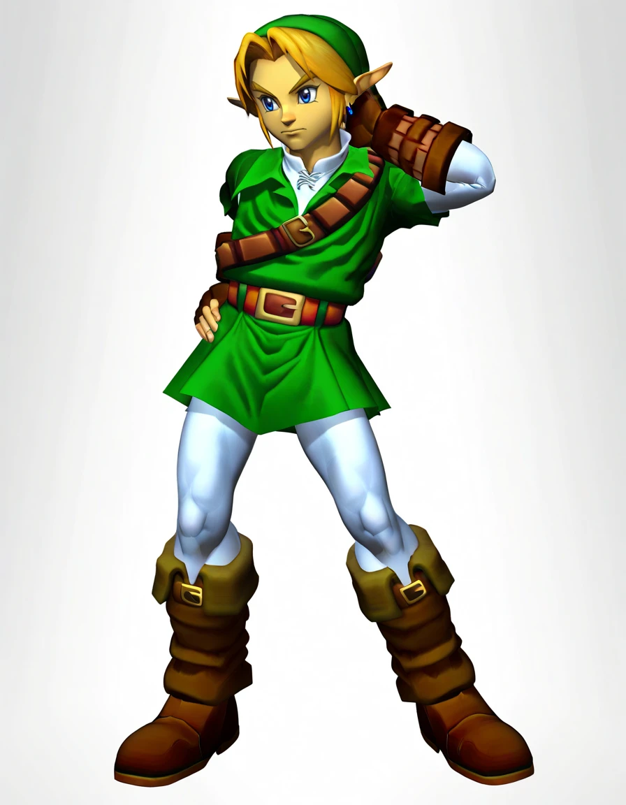 meleelink, 3d, 1boy, link, the legend of zelda: ocarina of time, solo, male focus, white pantyhose, white undershirt, collared shirt, layered sleeves, green tunic, green headwear, green pleated skirt, shoulder belt, blue eyes, blue hoop earrings, blonde hair, brown fingerless gloves, brown elbow gloves, brown knee boots, masterpiece, best quality, absurdres, very aesthetic, <lora:meleelink:1>Prompt with weapons (difficult to produce good-looking images):