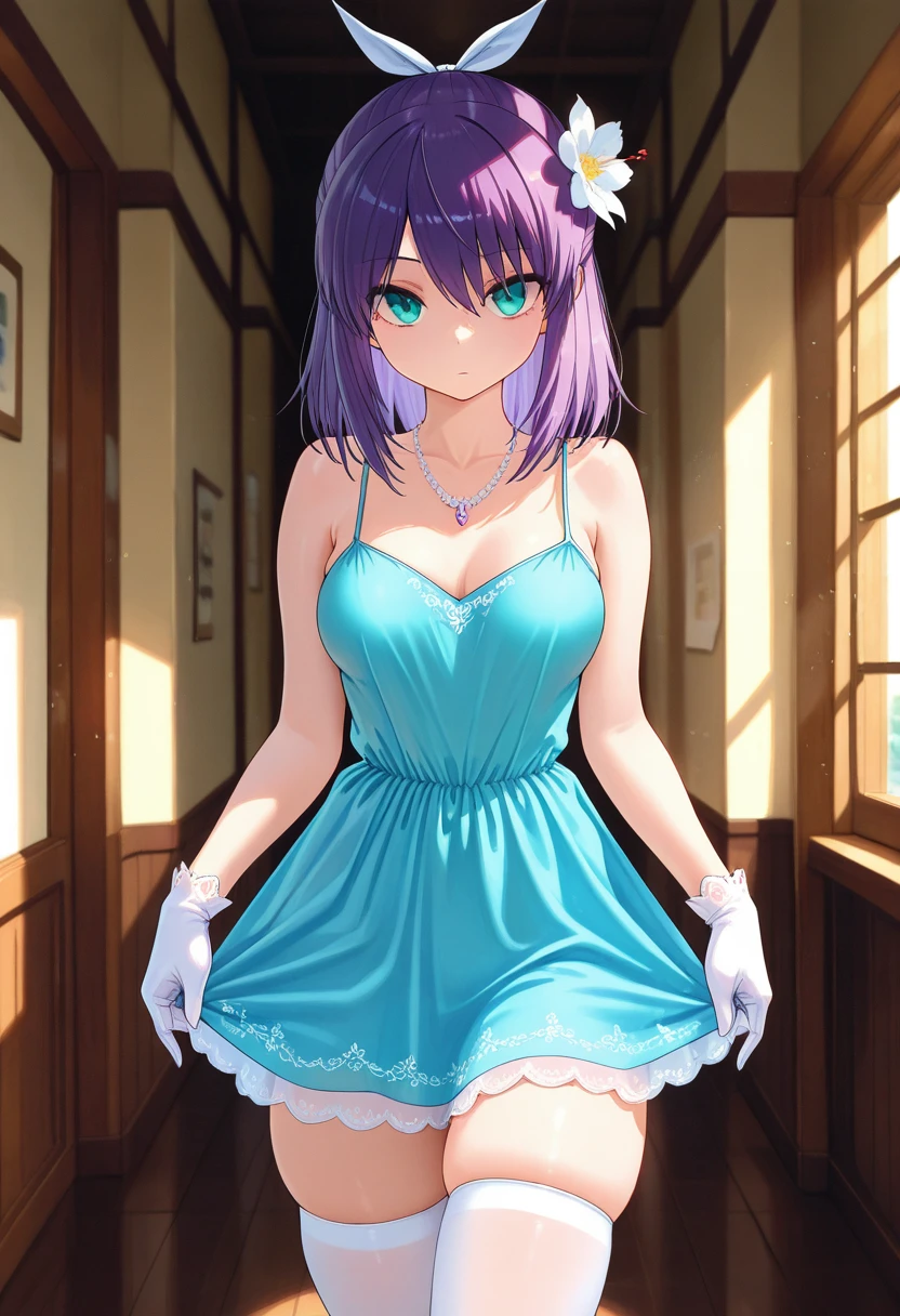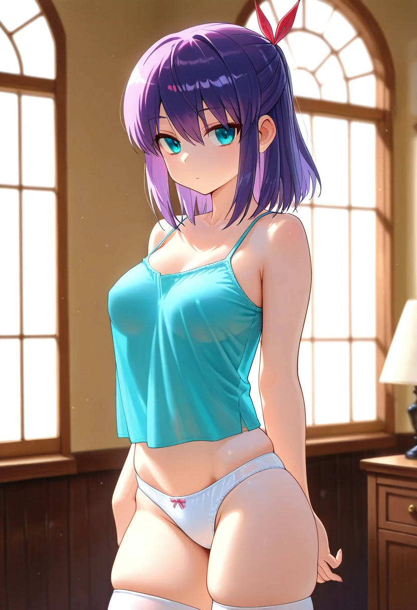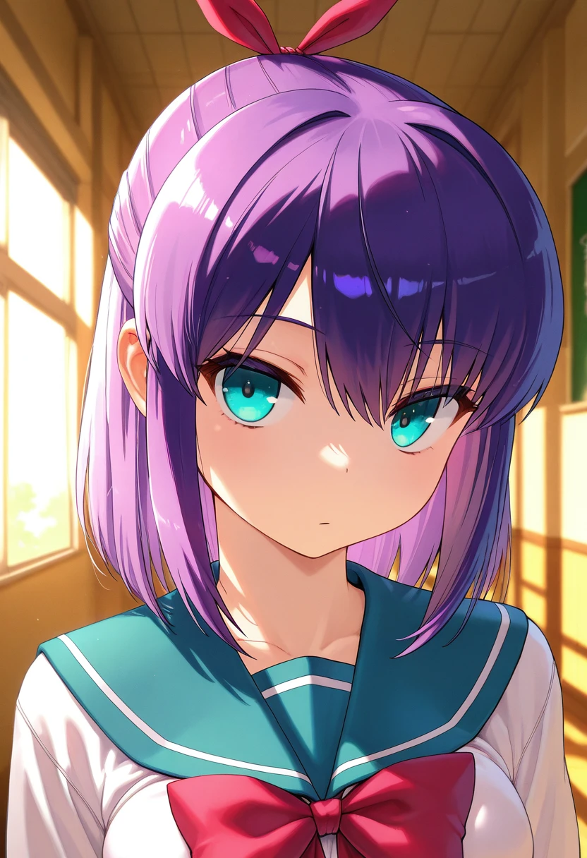 shionww, aqua eyes, purple hair, medium hair, half updo, hair ribbon, medium breasts,