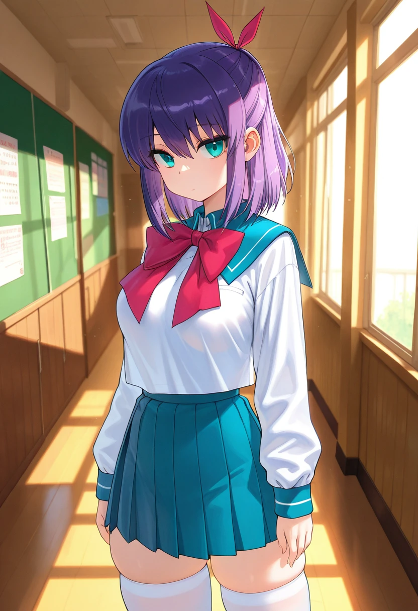 school uniform, serafuku, bowtie, long sleeves, pleated skirt, zettai ryouiki, white thighhighs,