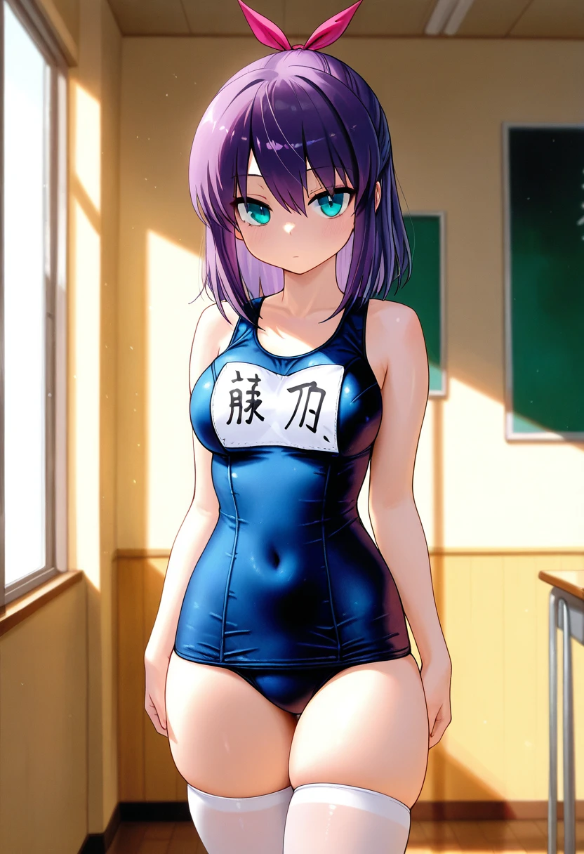 school swimsuit, name tag, thighhighs,