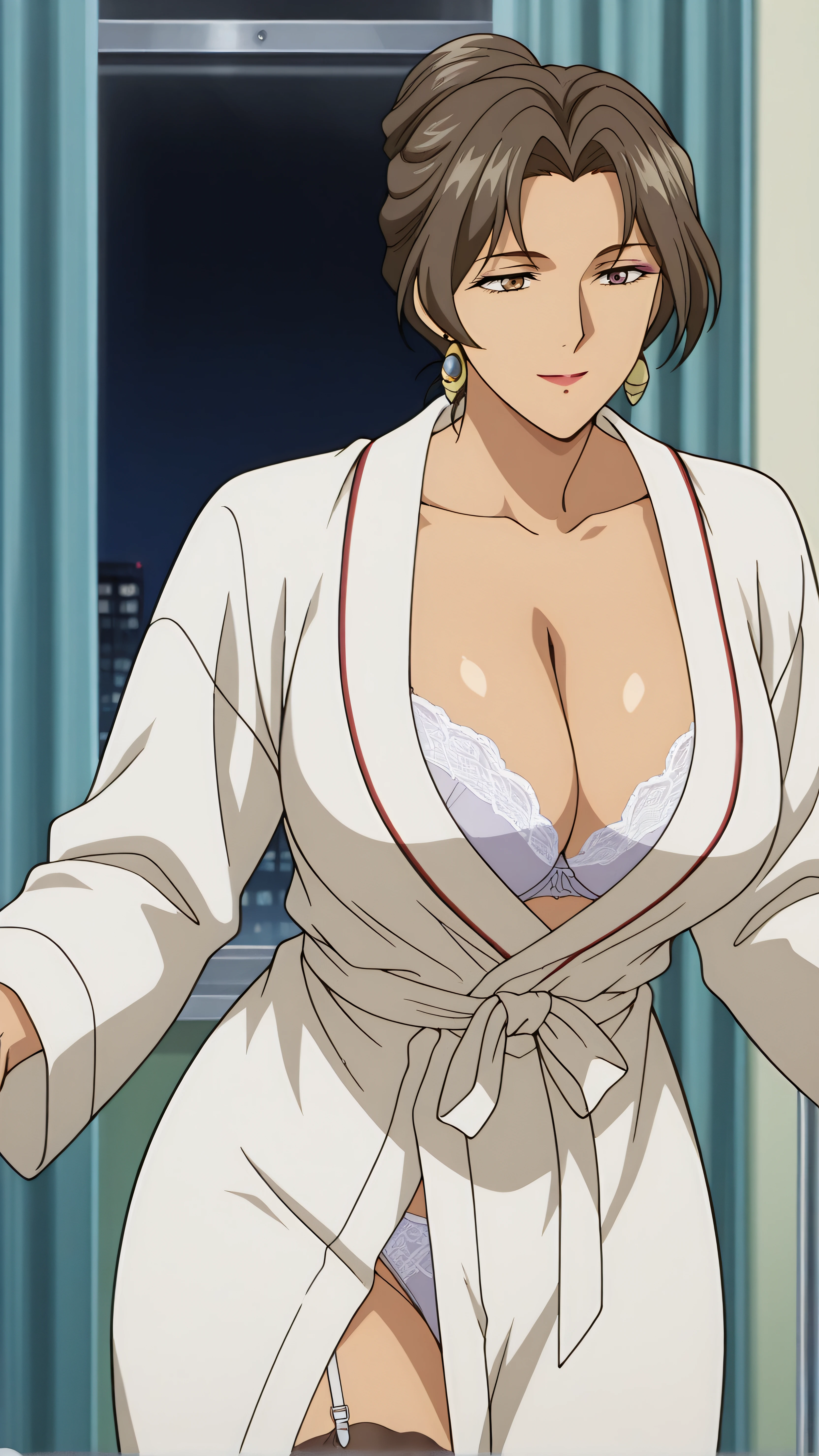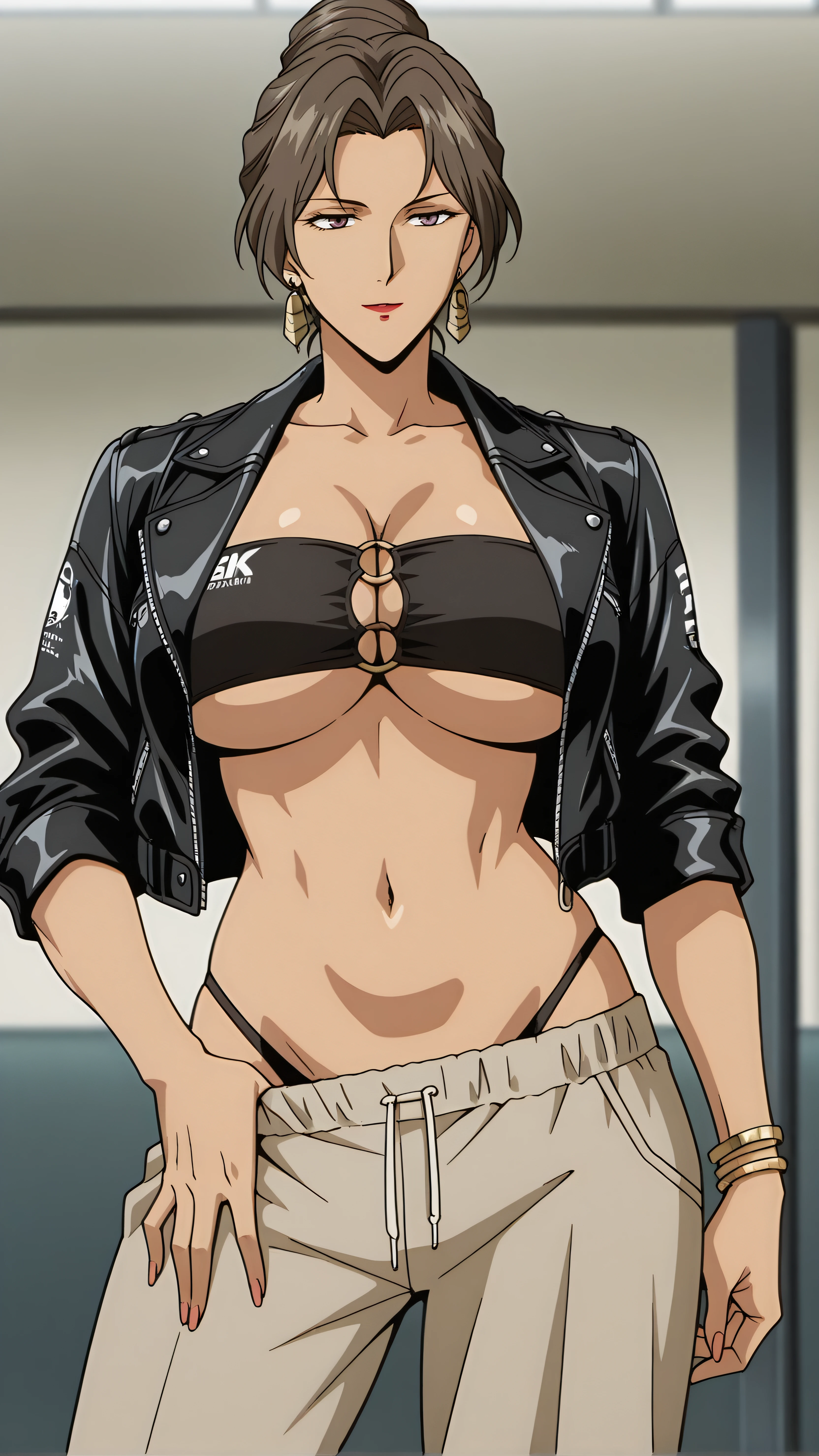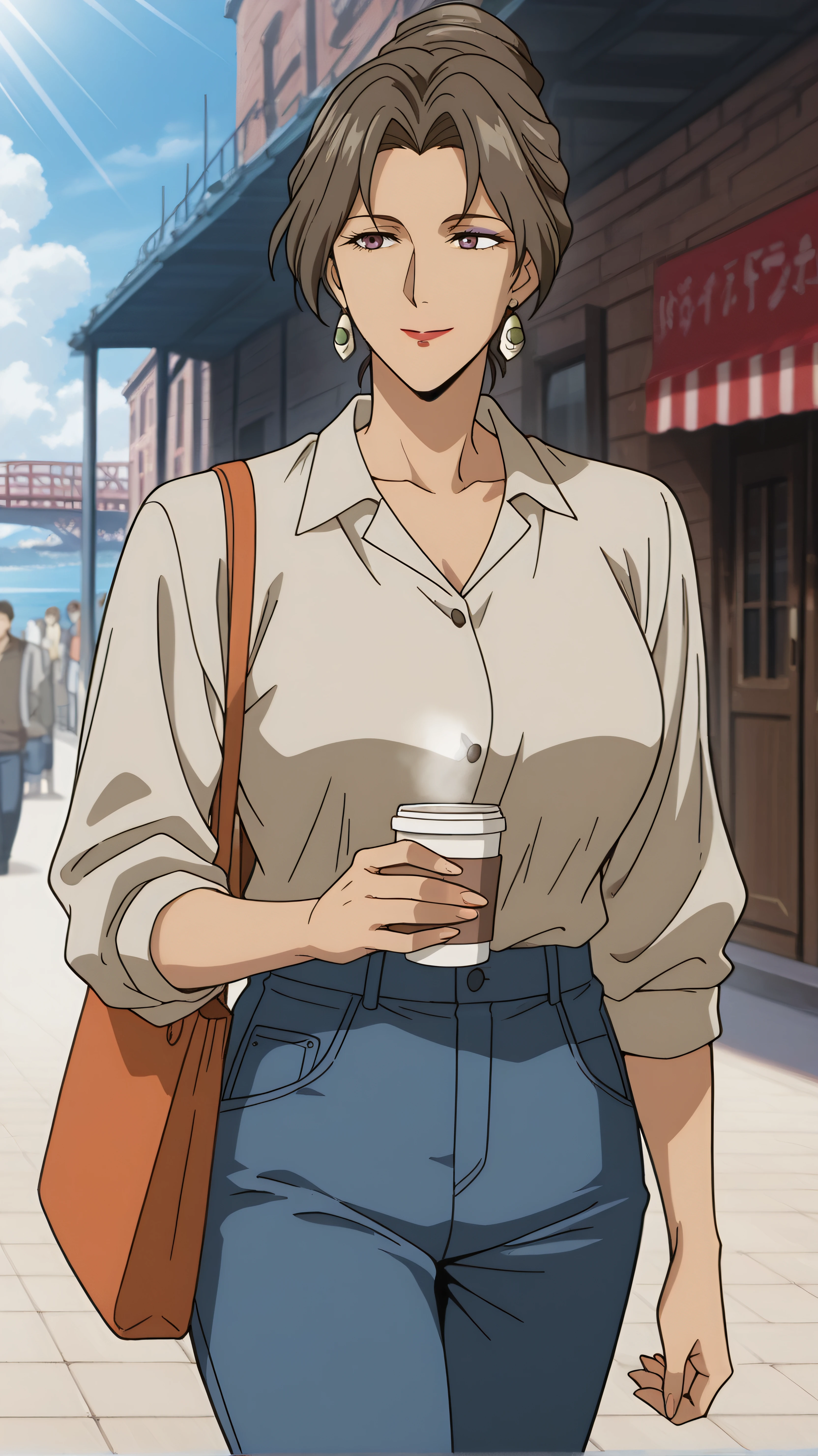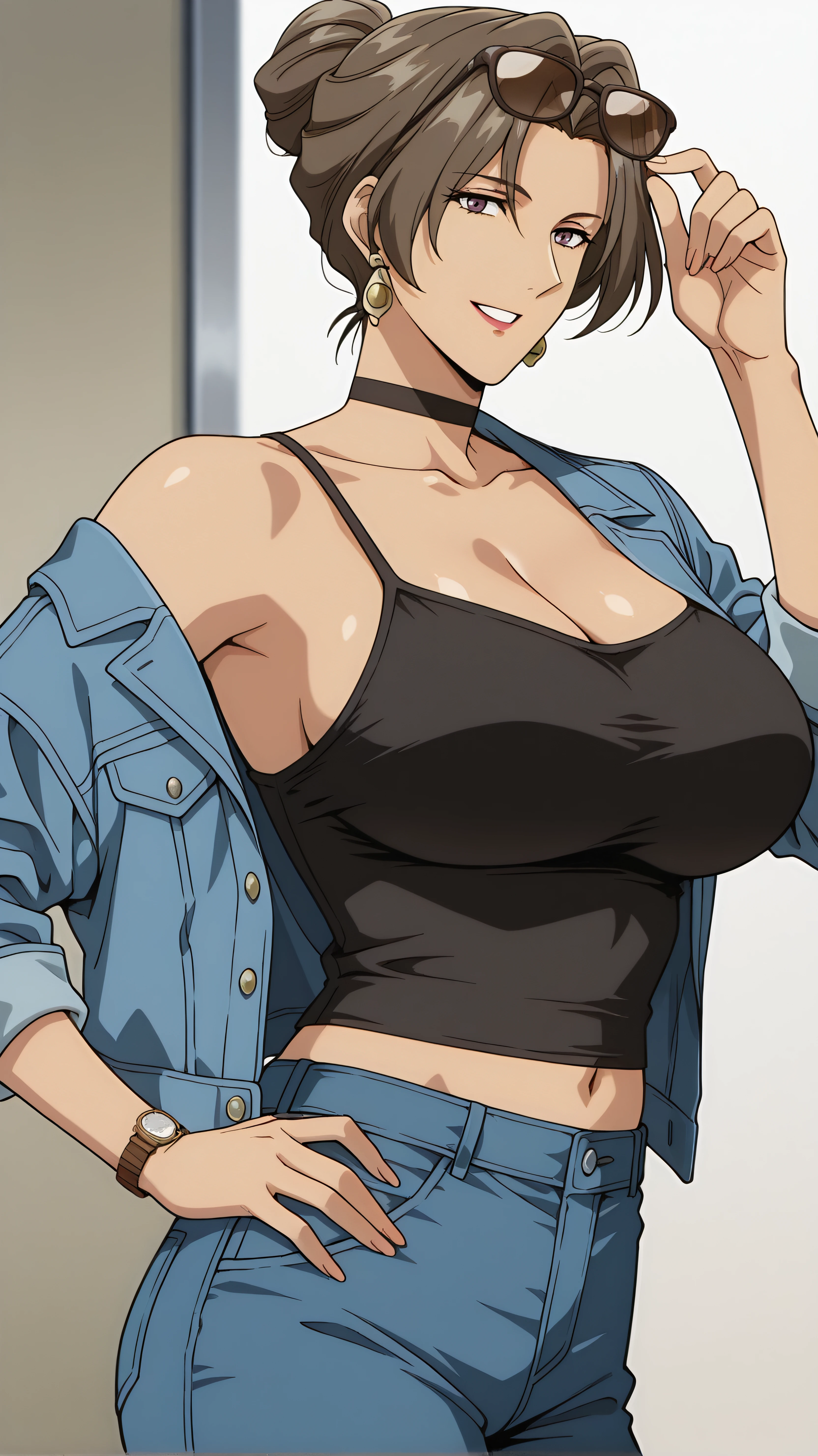rosa martinez, brown hair, makeup, mature female, hair bun, single hair bun, brown eyes, purple eyes