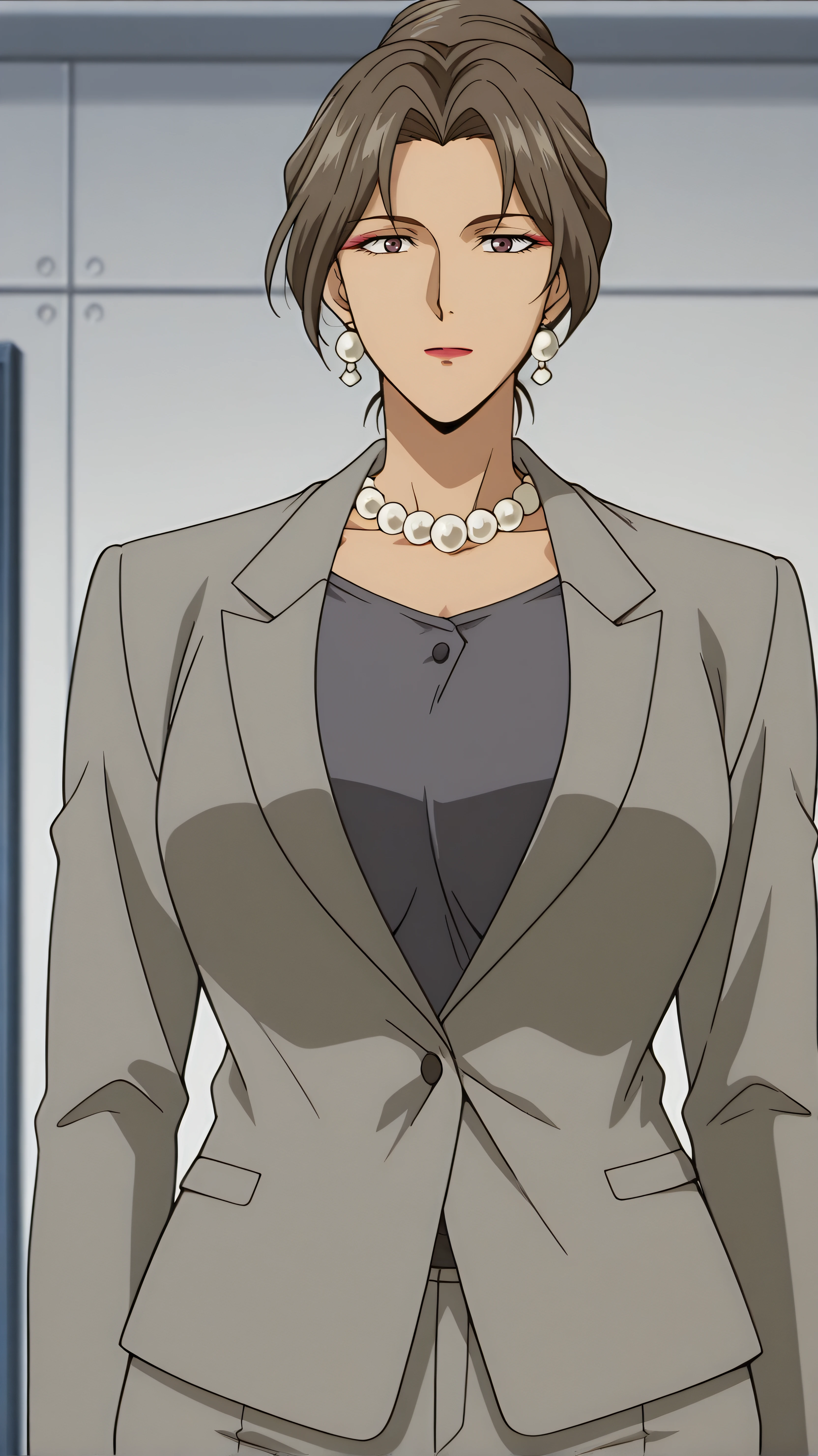 grey suit, jacket,grey pants,, grey shirt, , pearl necklace,