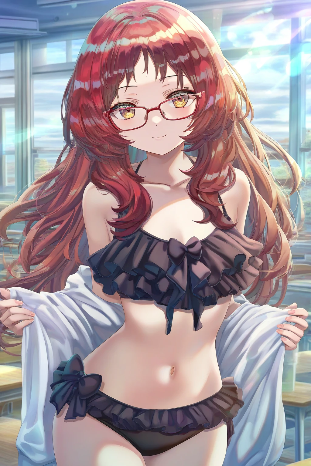 aimie, long hair, red hair, brown eyes, glasses, red-framed eyewear,