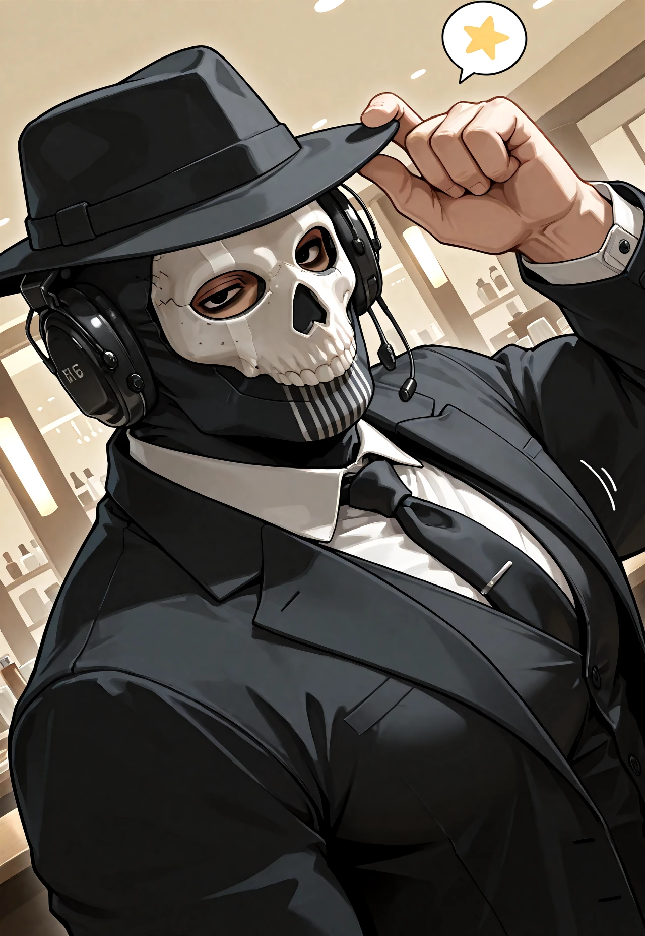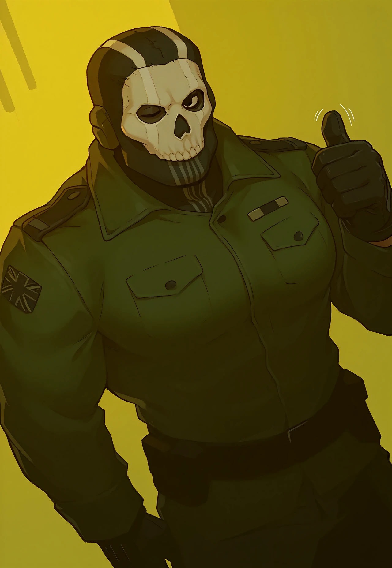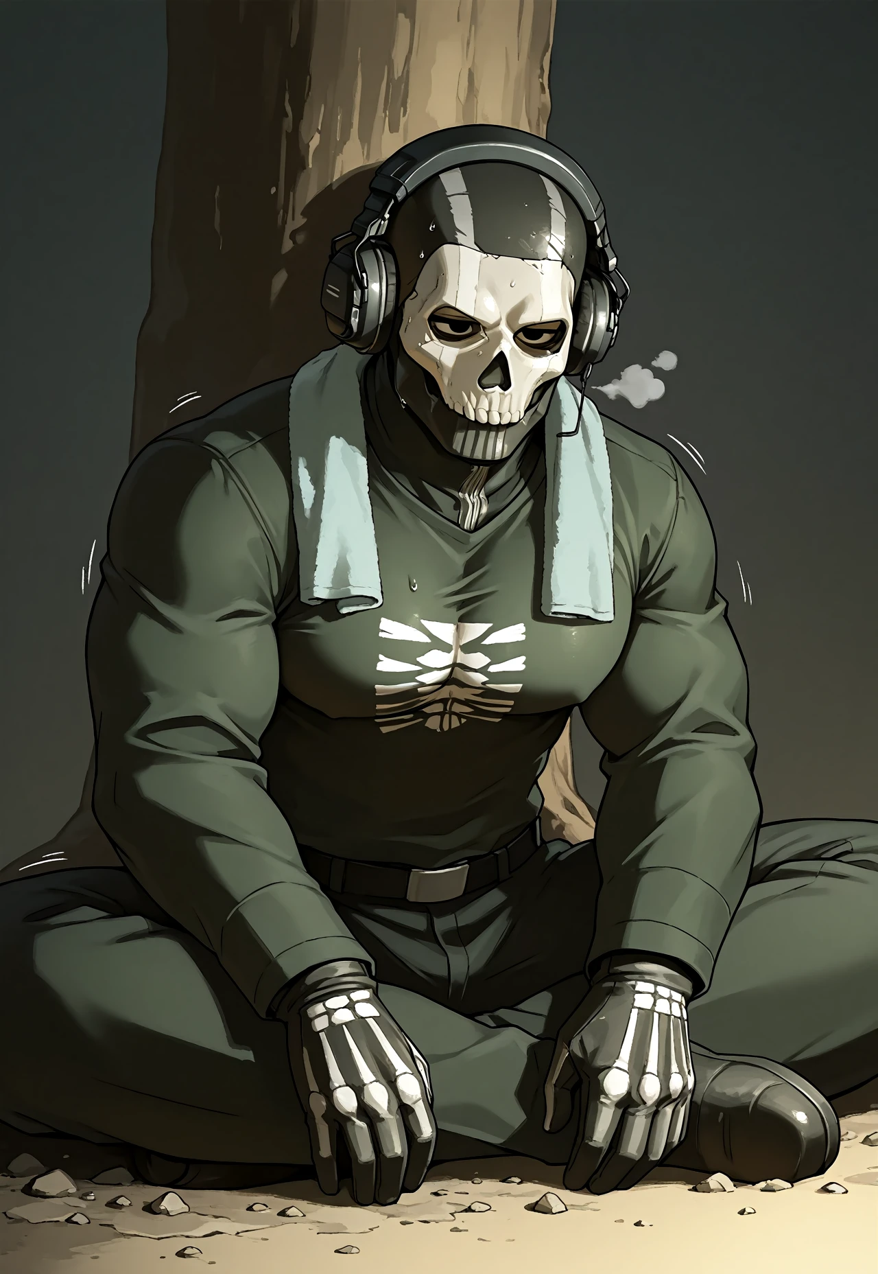 Simon Riley, Ghost, military mask, black eye paint, black eyes, (no mouth), , (black eyes:1.4, big pupil:1.2), Active military headphonesClothes: