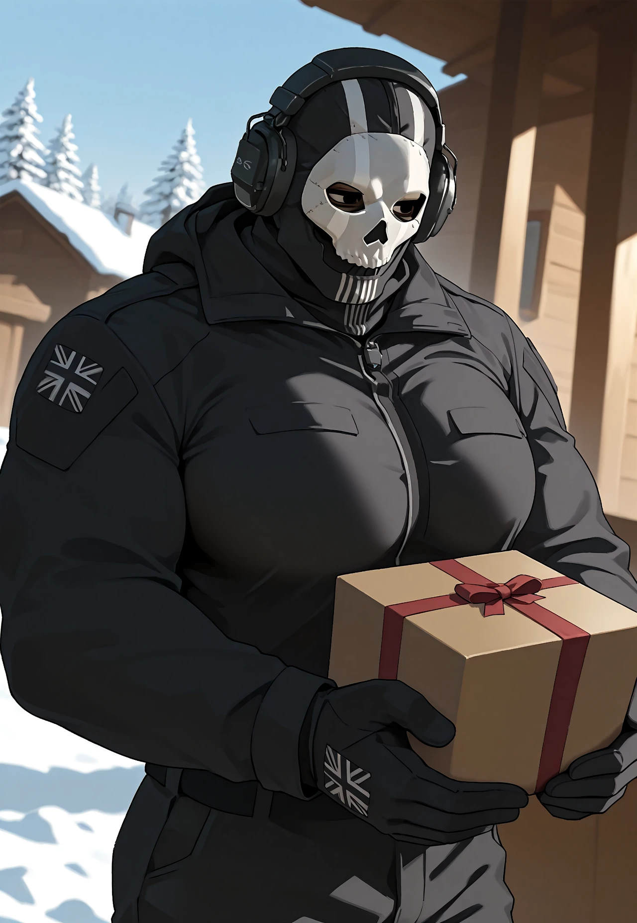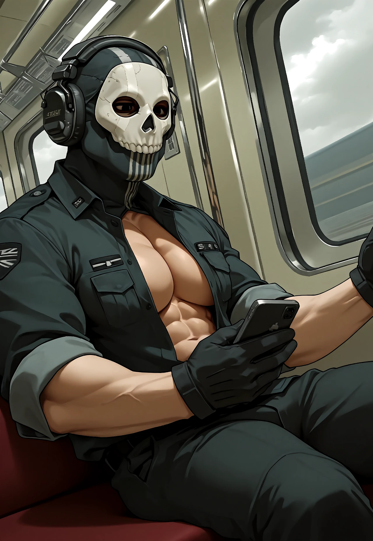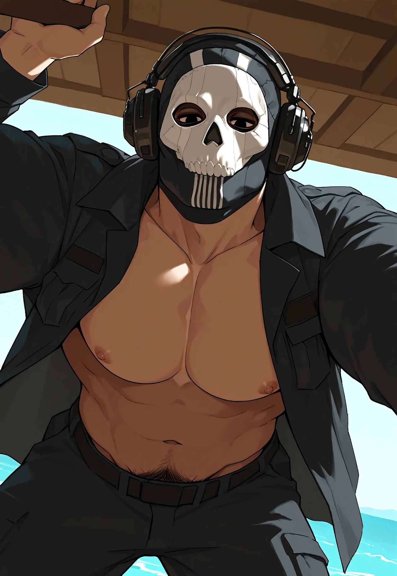 Simon Riley, Ghost, military mask, black eye paint, black eyes, (no mouth), , (black eyes:1.4, big pupil:1.2), Active military headphones