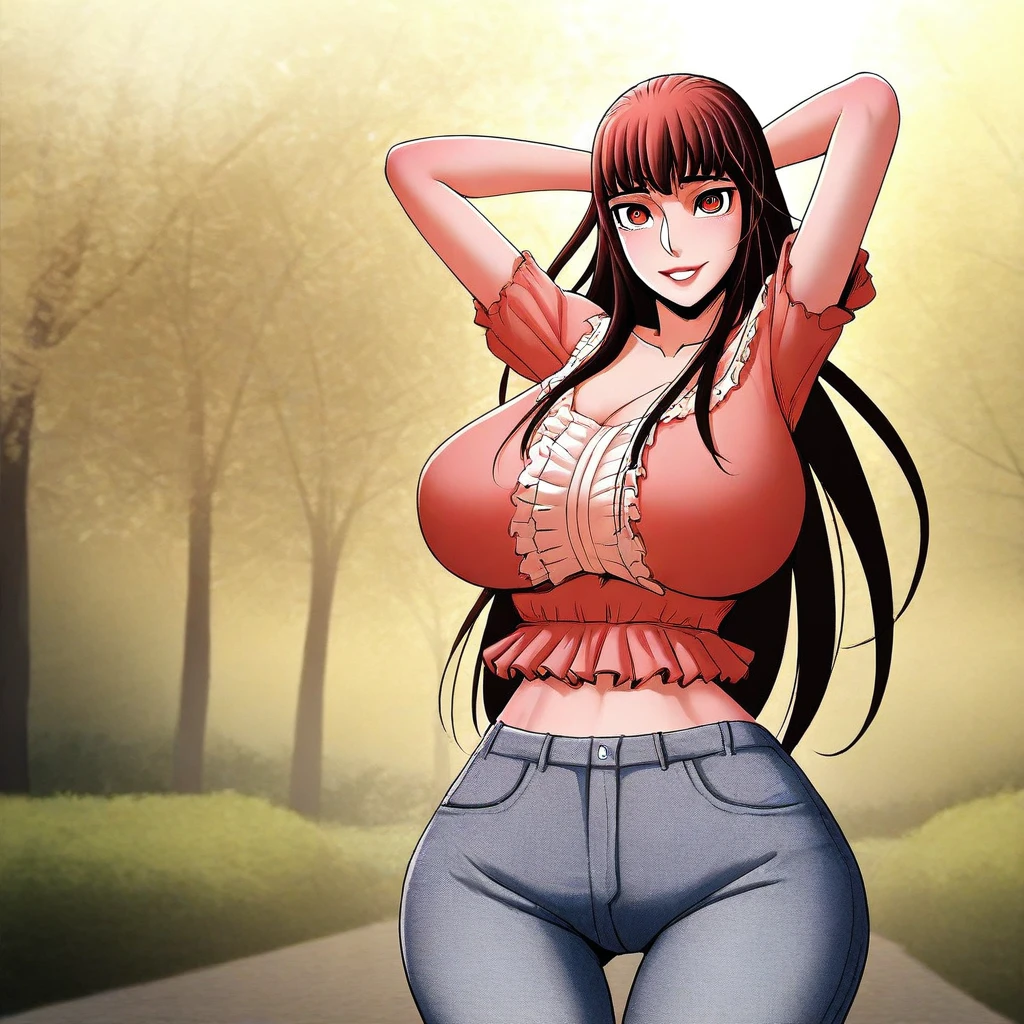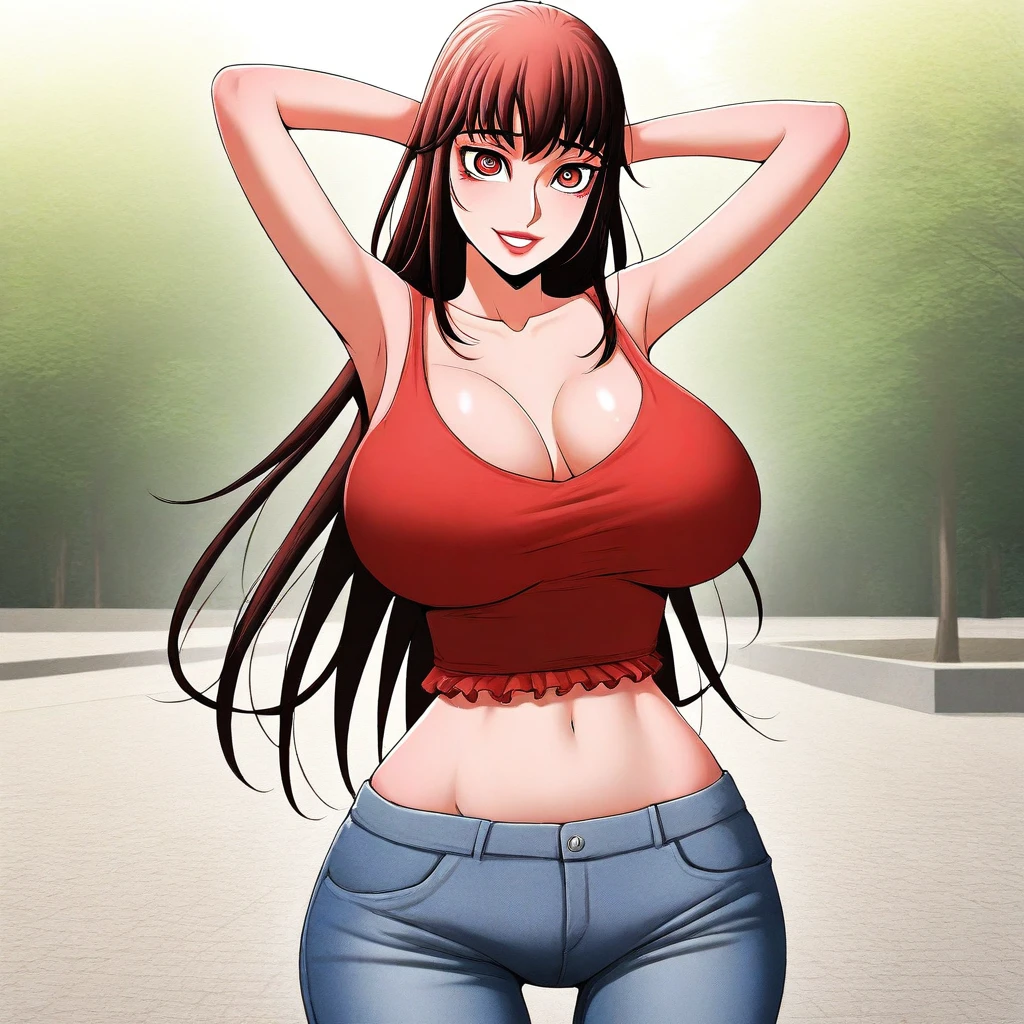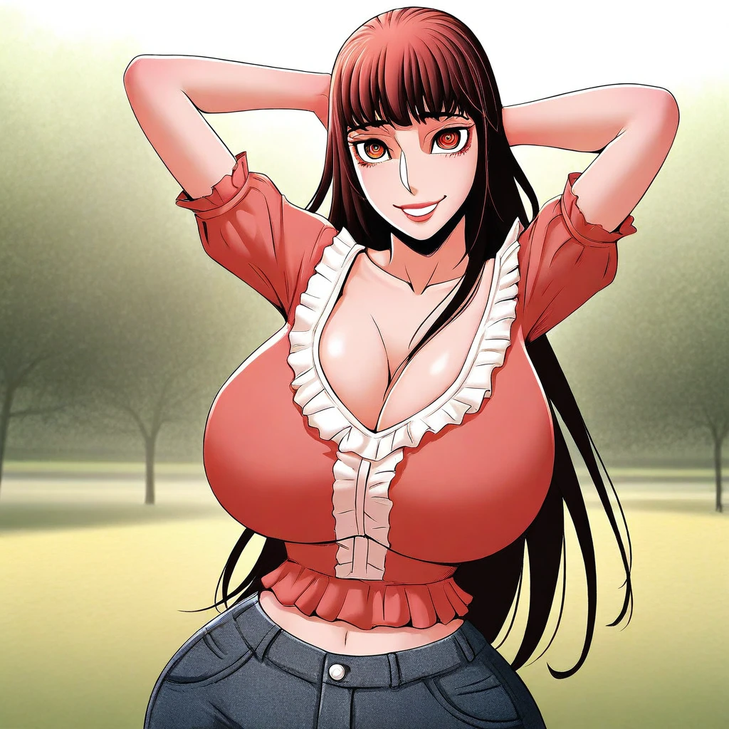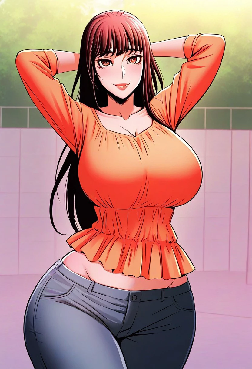 (( <lora:oh_yu-ra:1> , oh_yu-ra, thin waist, wide hips, beautiful skin, beautiful amber eyes, clear eyes, bright pupils, beautiful eyes, beautiful brown hair, beautiful long hair, bangs, huge and shaggy breasts, natural beauty, extraordinary beautiful woman, attractive woman, super sexy woman, lustful body, sexy woman with seductive obscene body, sensual body, voluptuous body, sexy beauty, no piercings, no piercing, makeup, )),