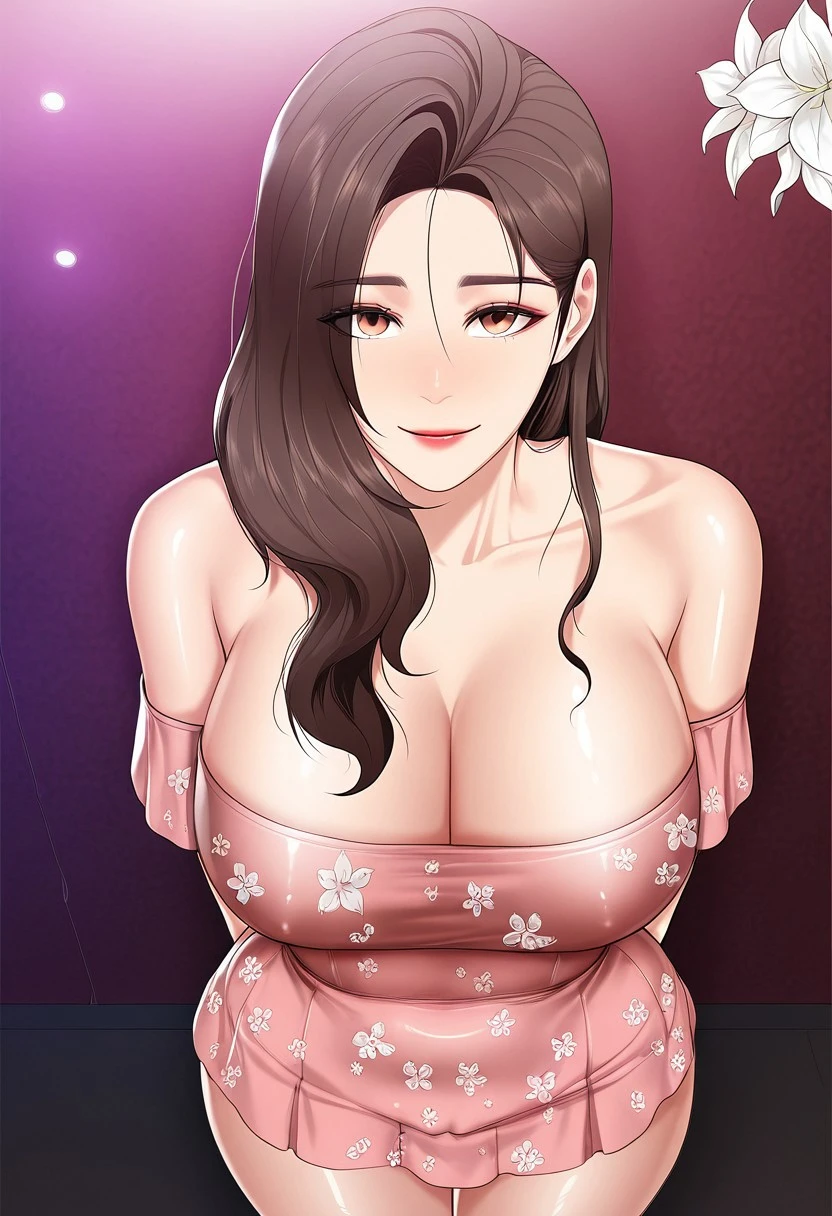 14. ((sexy beautiful white flower printed short-sleeves off-shoulder pink dress, obscene cleavage, huge cleavage, )) beige high-heels, black panties, white flip-flops,