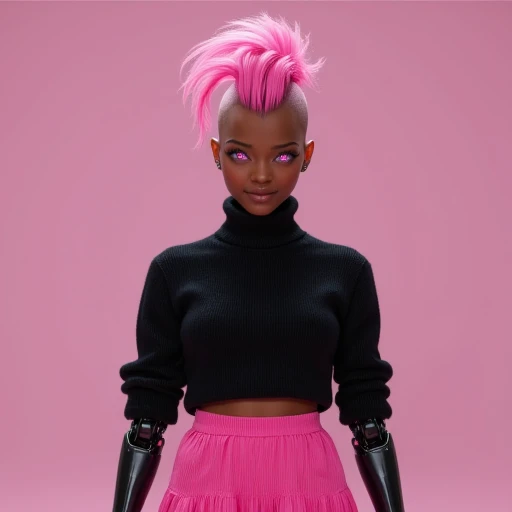 perfect face, pink eyes, pink mohawk, dark brown skinned, black robotic limbs, 19-year-old Black Hispanic cyborg with a robotic body