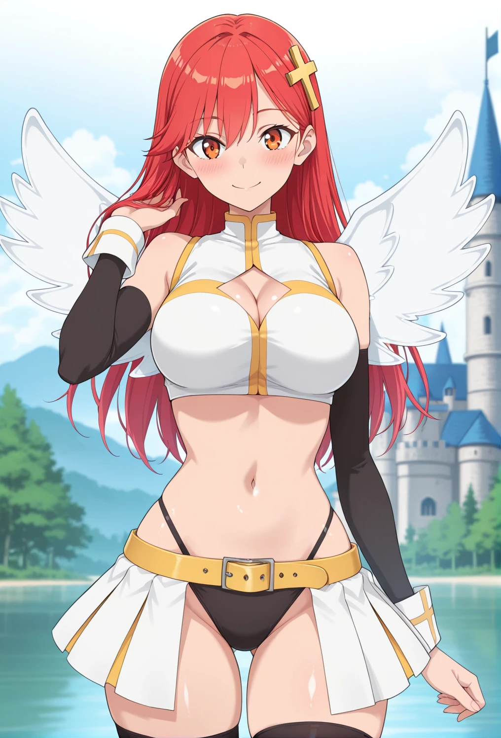 ariel,red hair,long hair,straight hair,orange eyes,large breasts,angel wings,yellow cross hair ornament, ariel cos, yellow-trimmed clothes, white shirts, collared shirts, crop top, midriff, navel, cleavage cutout, sleevelees, black armwear, white wrist cuffs, bikini bottom only, black bikini bottom, high leg, white half skirt, yellow belt, black thighhighs, white boots