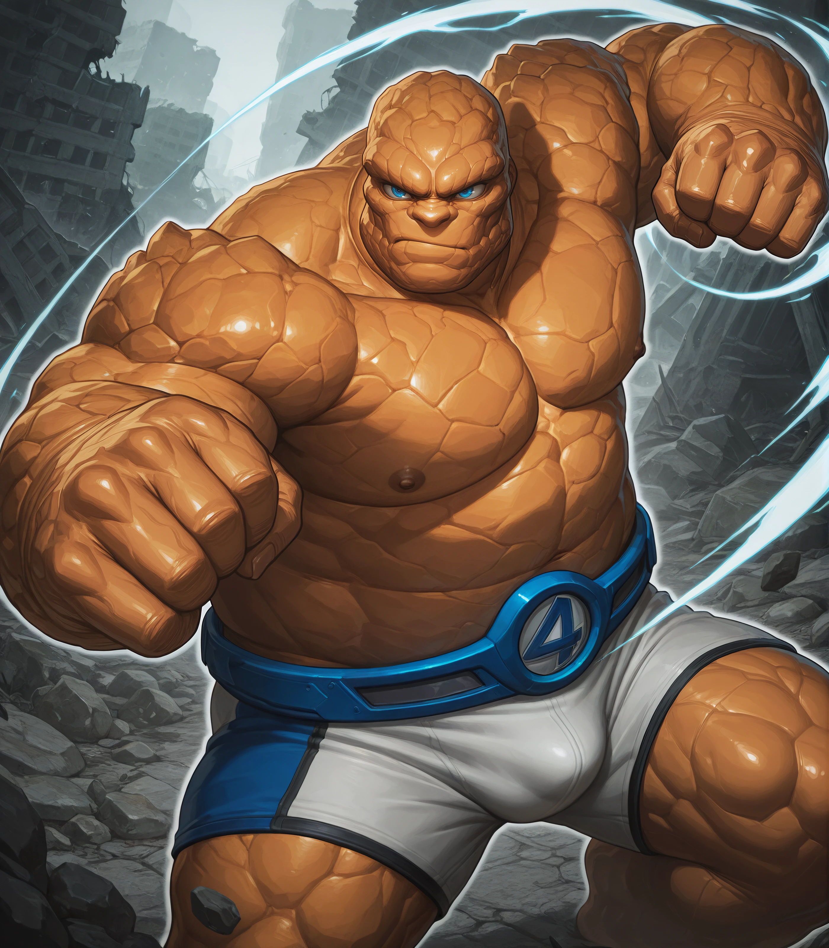 Ben Grimm, also known as The Thing, is one of the founding members of the Fantastic Four. Once a brilliant pilot and best friend of Reed Richards (Mr. Fantastic), Ben was transformed into a rock-like creature after being exposed to cosmic rays during a space mission. His appearance, now covered in thick orange stone, makes him appear monstrous, but underneath he is still a deeply loyal, courageous, and witty man. Ben Grimm often struggles with his transformation, both physically and emotionally, and faces the challenges of being a hero despite his rocky exterior. His catchphrase, "It's clobberin' time!", is one of the most iconic lines in Marvel comics. Despite his outward gruffness, Ben remains one of the heart and soul of the Fantastic Four, always fighting for what is right and standing by his friends and family.