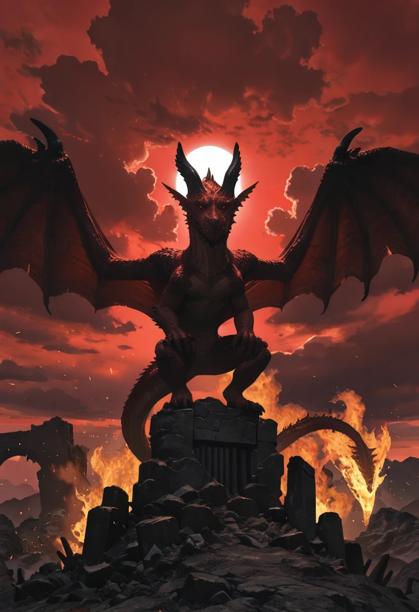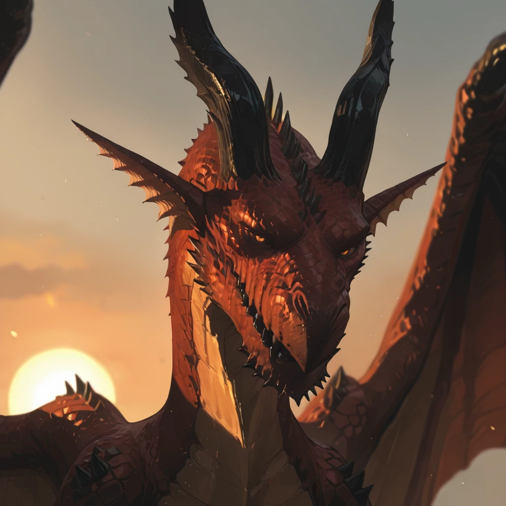 Grigori,rough crimson-red scales,glowing orange-red eyes,slit pupils,two horns,spiked jaw,dragon