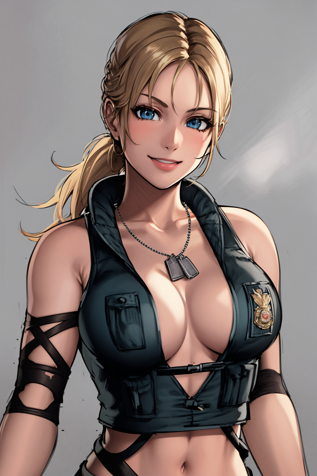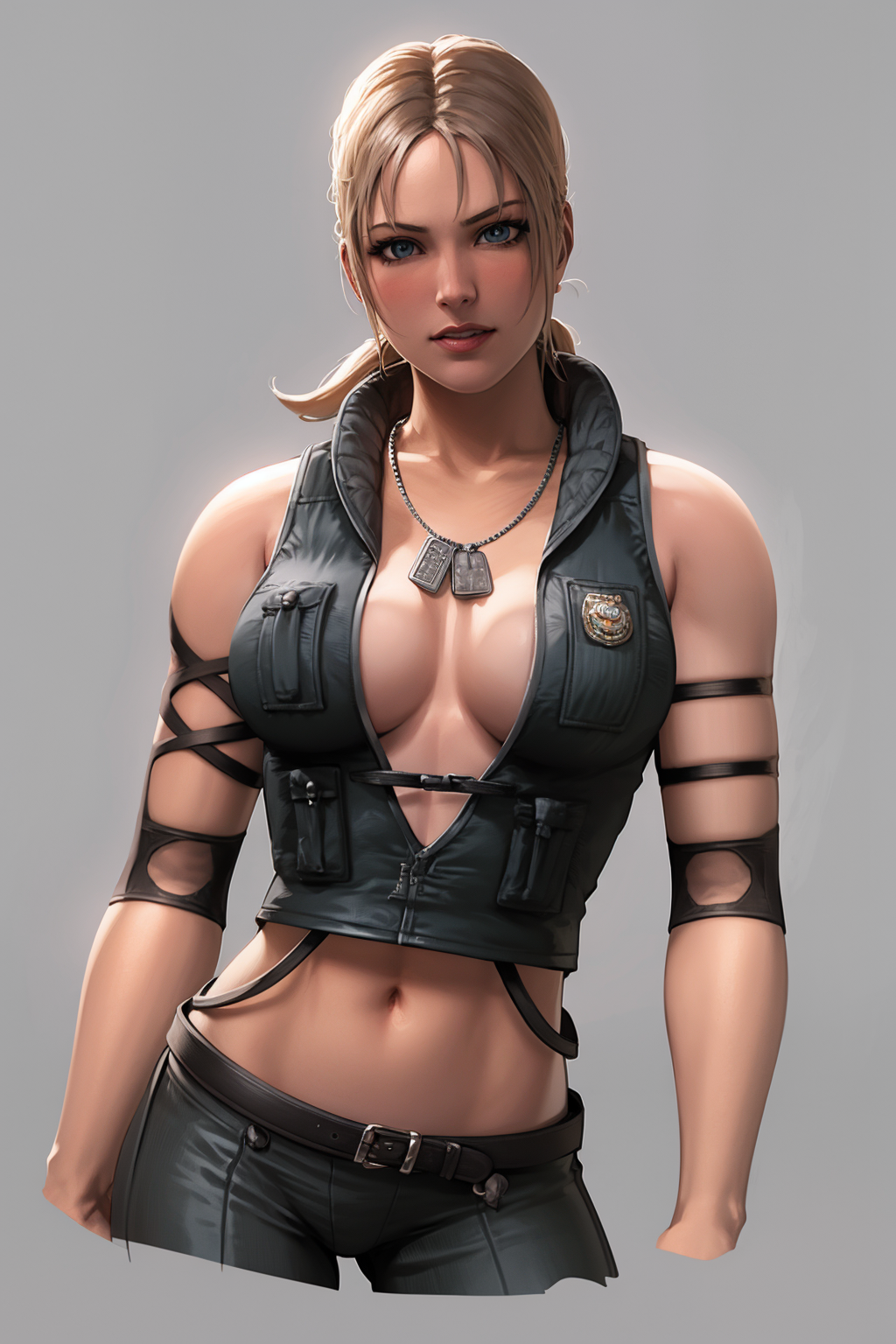 Outfit prompts : vest, abs, boots, cleavage, dog tags, fingerless gloves, midriff, navel, pants, knee pads