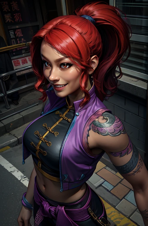 KimWU, red hair, ponytail, brown eyes, arm tattoo,