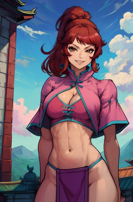 was trained in several pinkish martial arts gear - Pelvic curtain, crop tops, etc,
