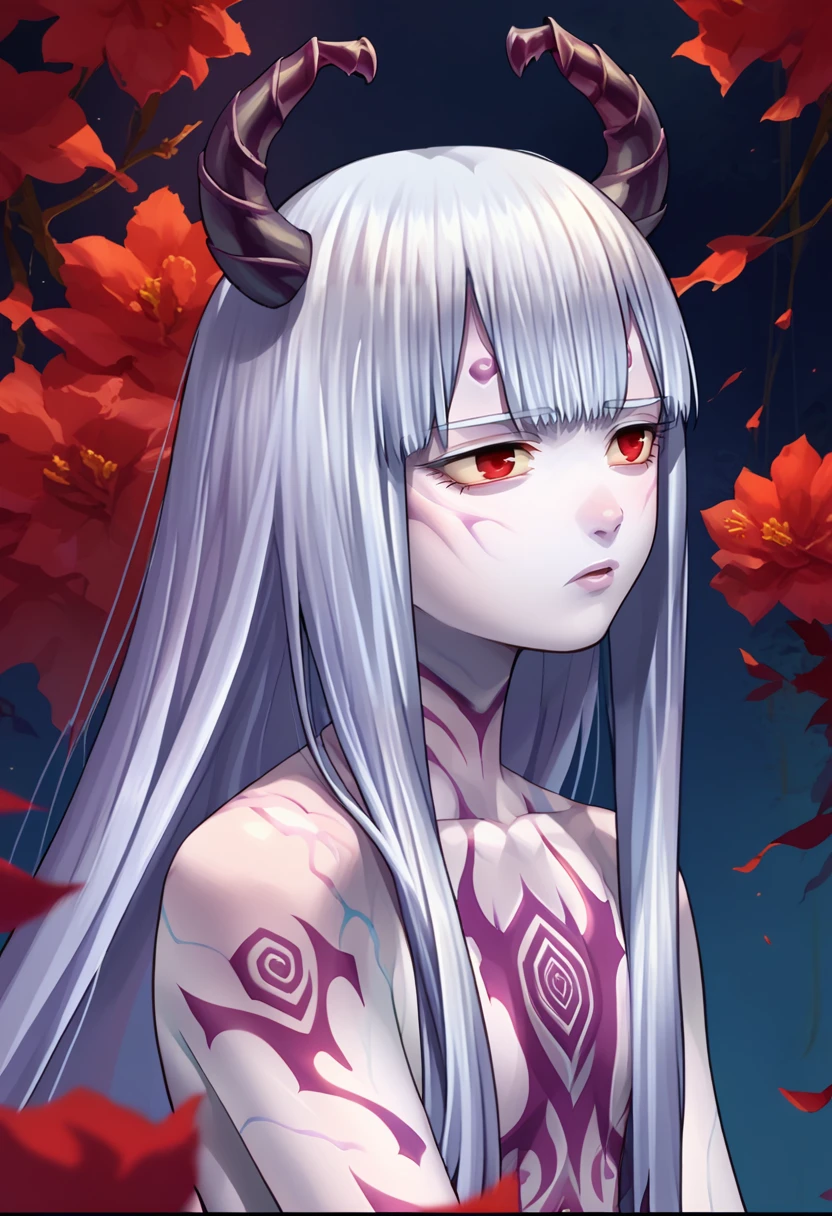 Uematsu Rikako, silver hair, long hair, red eyes, tsuchigumo form, horns, white skin, tattoos,