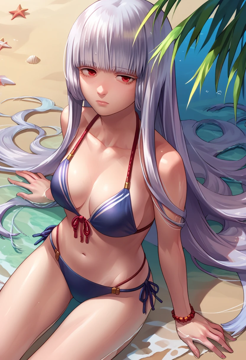 Uematsu Rikako, silver hair, long hair, low twin braids, red eyes, pendant, yellow ribbon, black kimono, purple skirt,