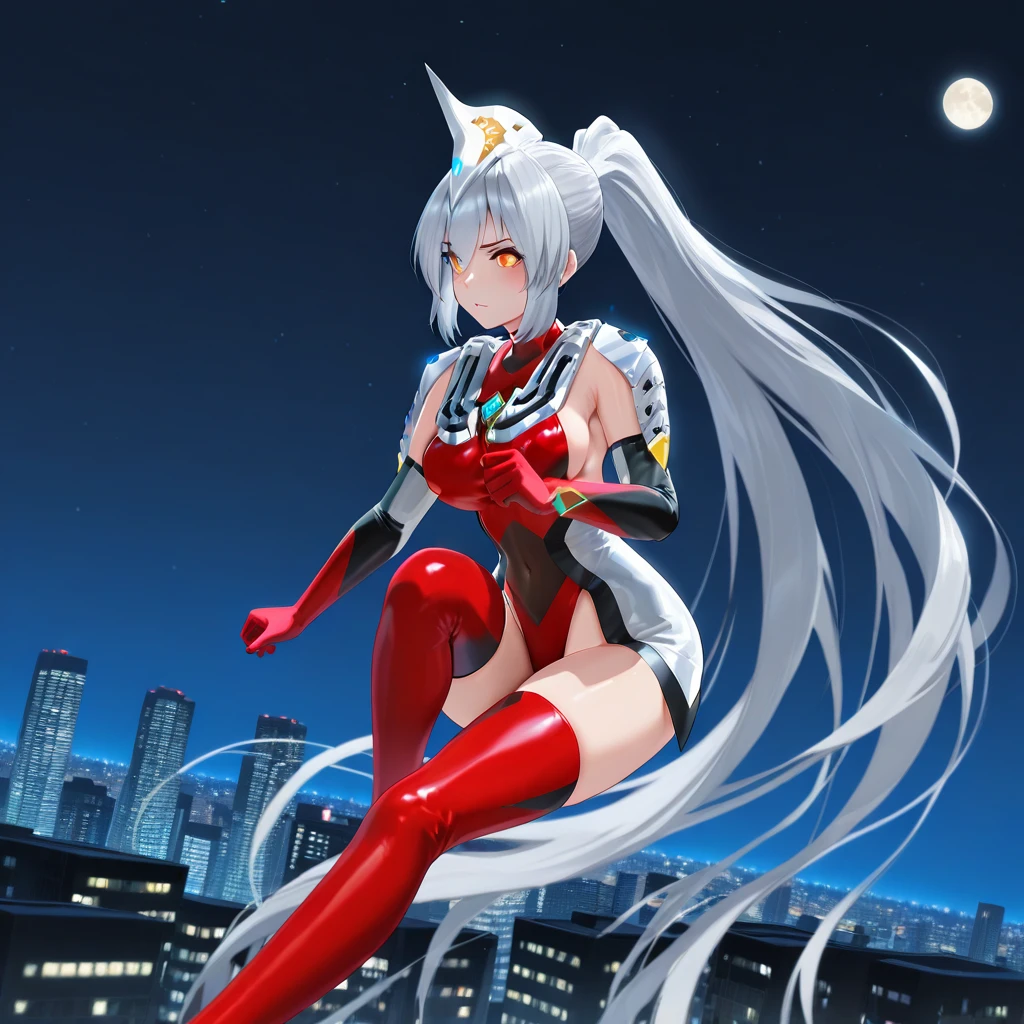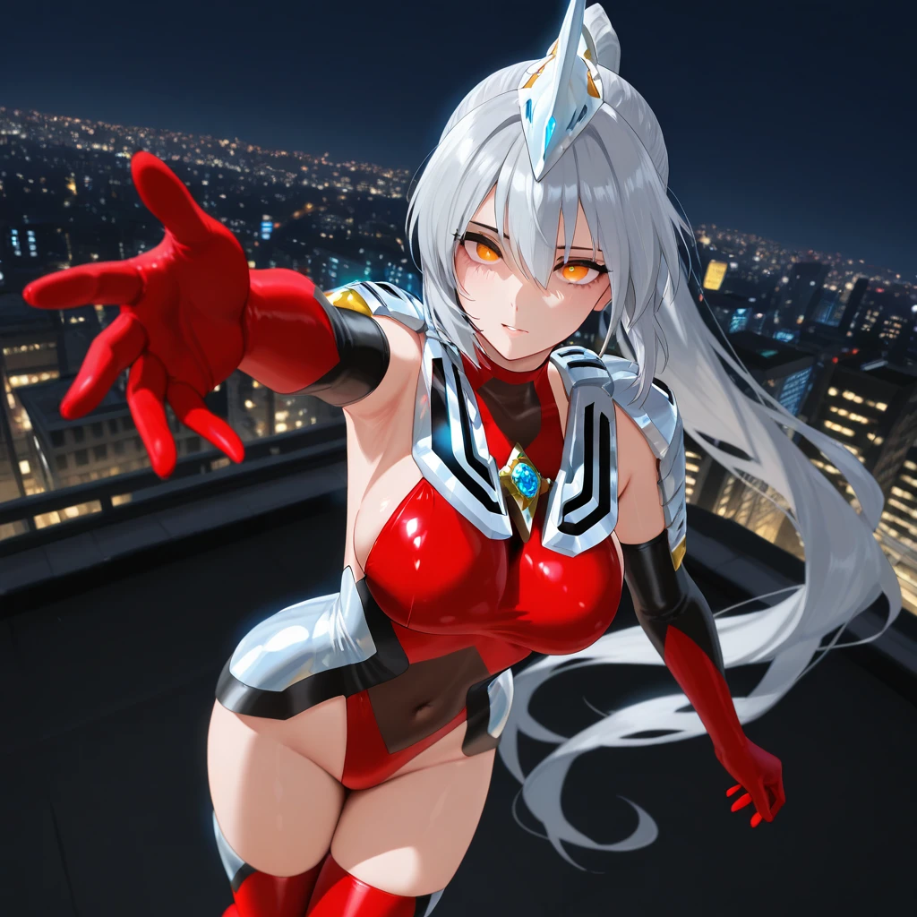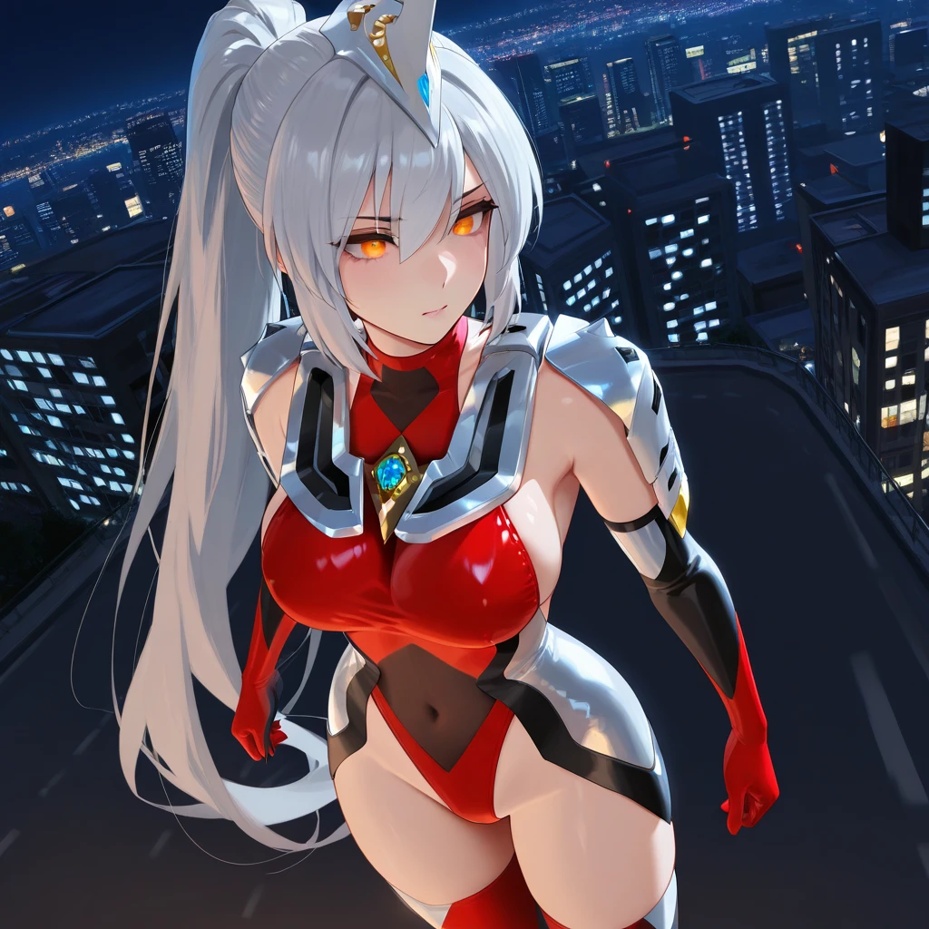 prompt: 1girl, ((solo)), grey hair, covered navel, horn, sideboob, orange eyes, covered navel, armor, medium breasts, personification, very long ponytail, red elbow gloves, silver shoulder pads, very long hair, red highleg leotard, red thigh boots