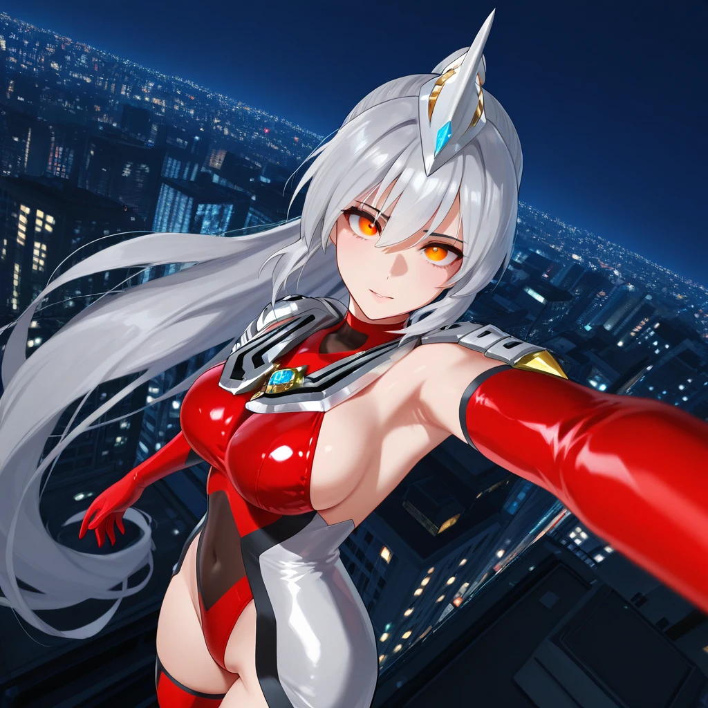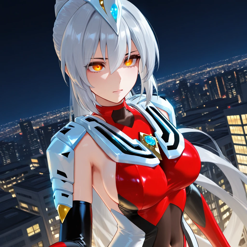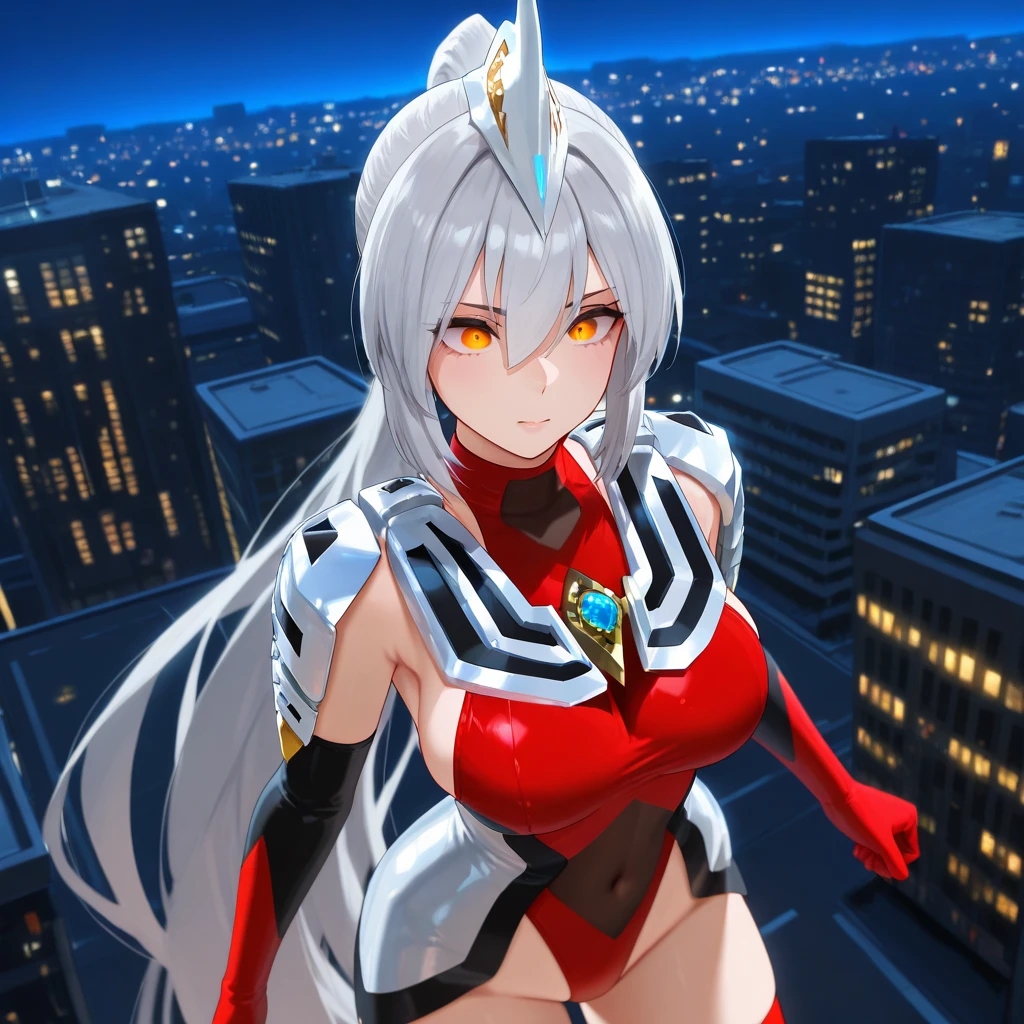 prompt: 1girl, ((solo)), grey hair, covered navel, horn, sideboob, orange eyes, covered navel, armor, medium breasts, personification, very long ponytail, red elbow gloves, silver shoulder pads, very long hair, red highleg leotard, red thigh boots