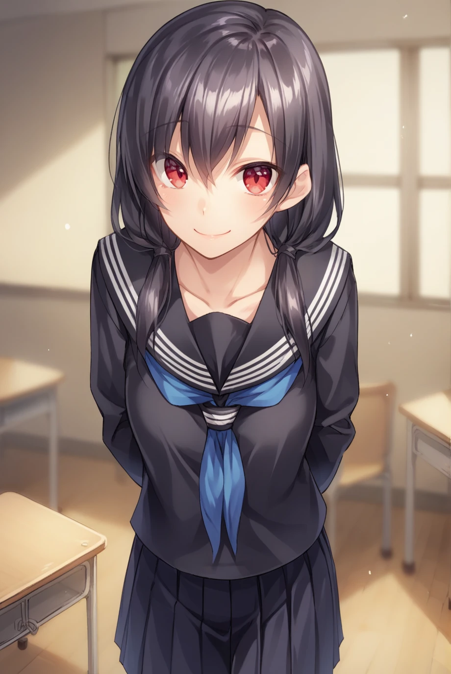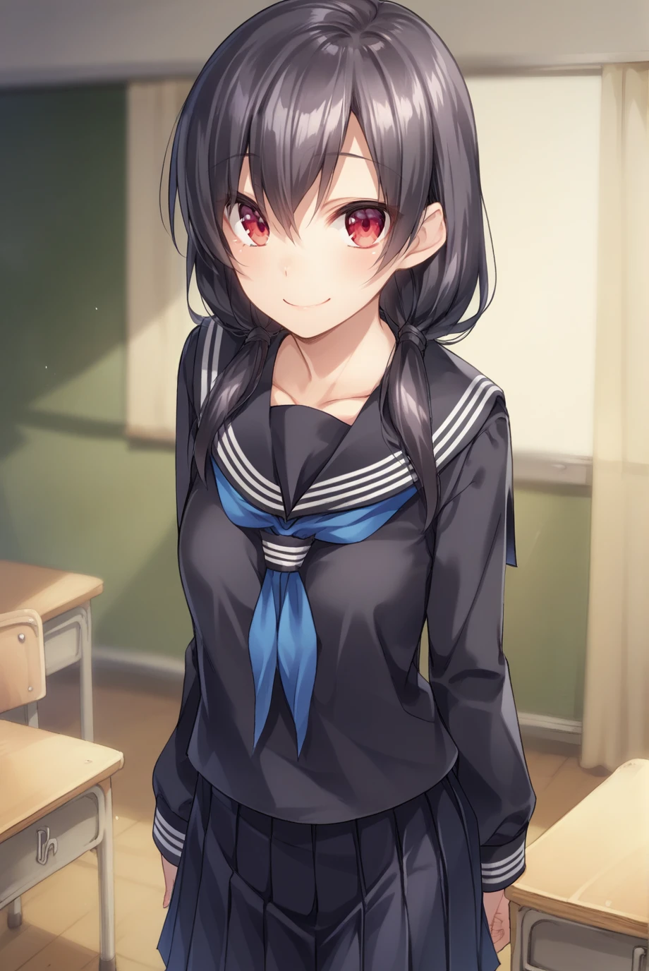 <lora:1room-IL-v2-07:0.8>, Chopio1room, black hair, shiny hair, hair between eyes, red eyes, looking at viewer,Outfit 1 (School Uniform):