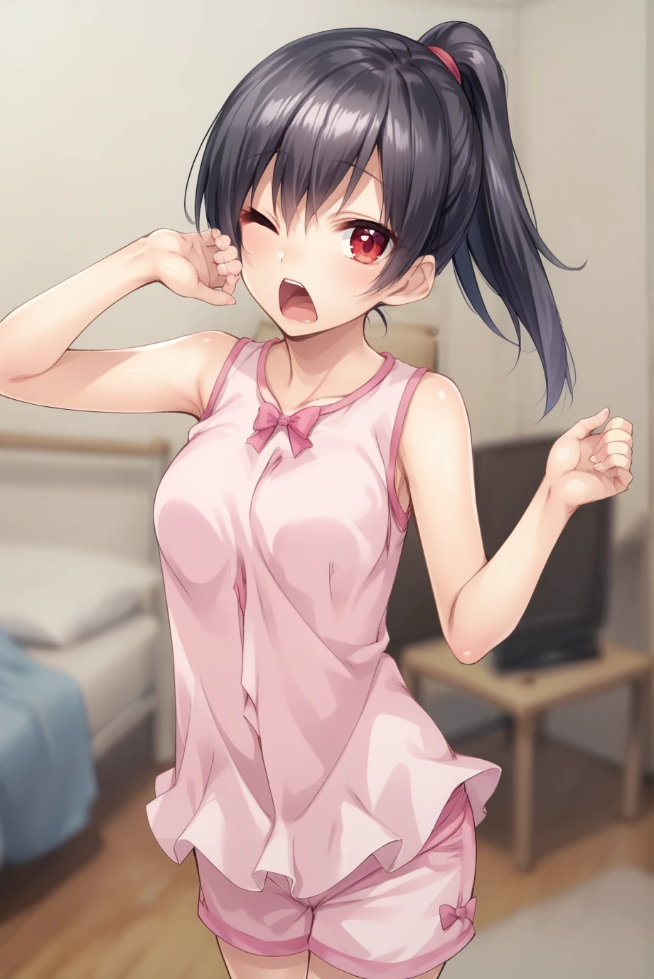 outfit_4, bare shoulders, sleeveless shirt, pink pajamas, pink shorts, pink bow, ruffles,