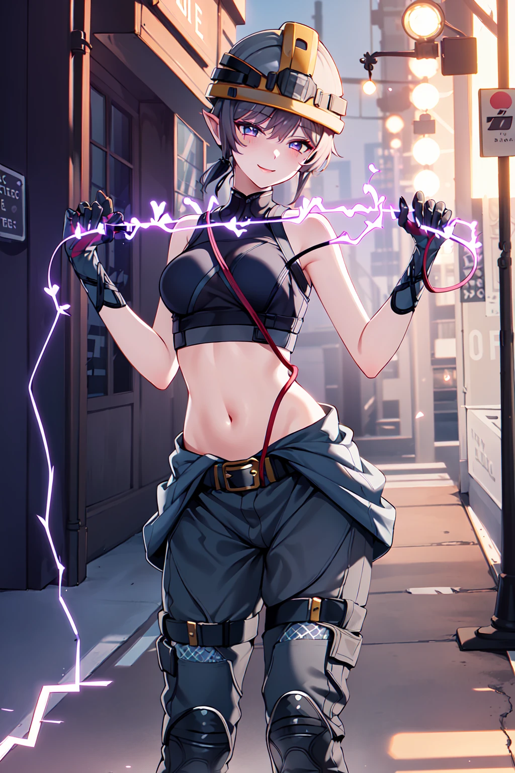 Worker Disguise: boots, yellow helmet, short hair, grey hair, black croptop, grey sweatpants, knee pads