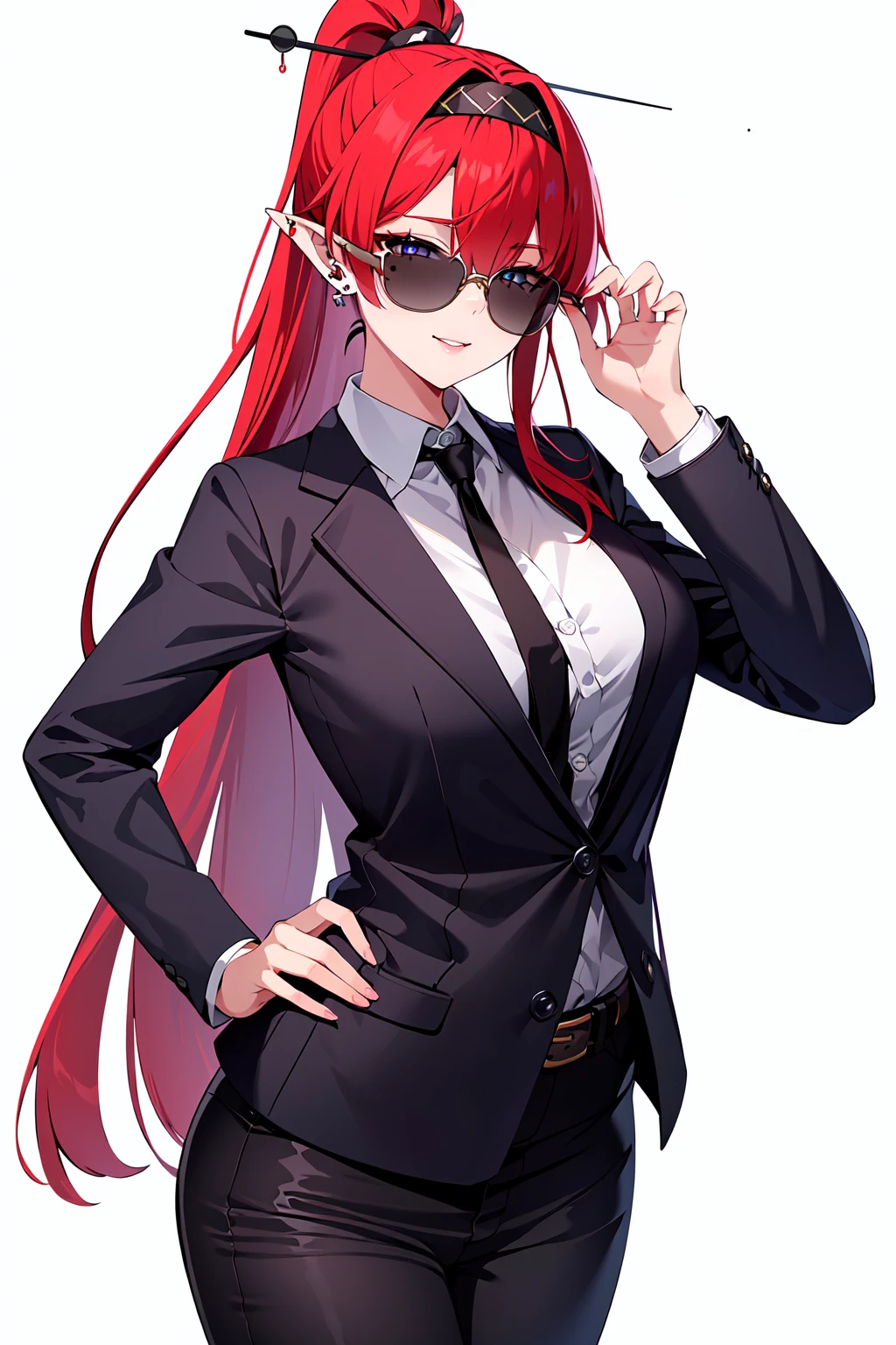 Agent Disguise: short hair, brown hair, white collared shirt, black tie, black formal jacket, belt, black pants, sunglasses