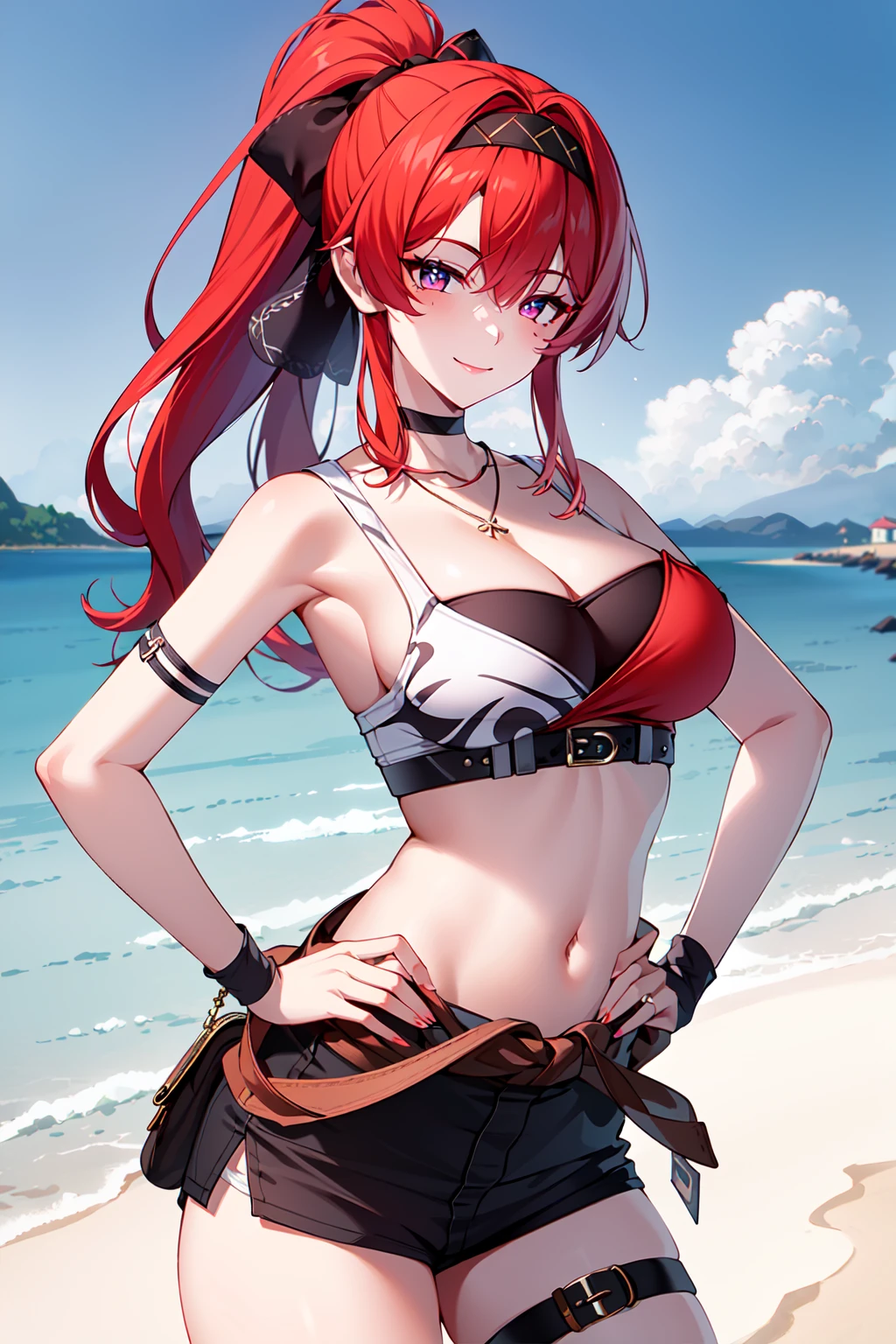 Summer Outfit: choker, white and red crop top, short shorts, hair bow, thigh strap, wristband, wrist sleeves, spaghetti strap handbag, necklace, clothes around waist