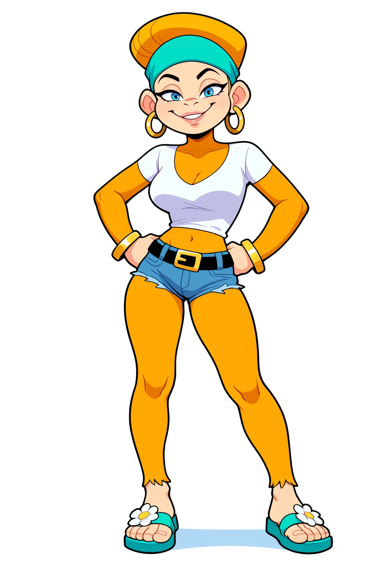 Outfit prompts : white shirt, belt, short shorts, denim shorts, sandals, cleavage, midriff, bracelet, navel