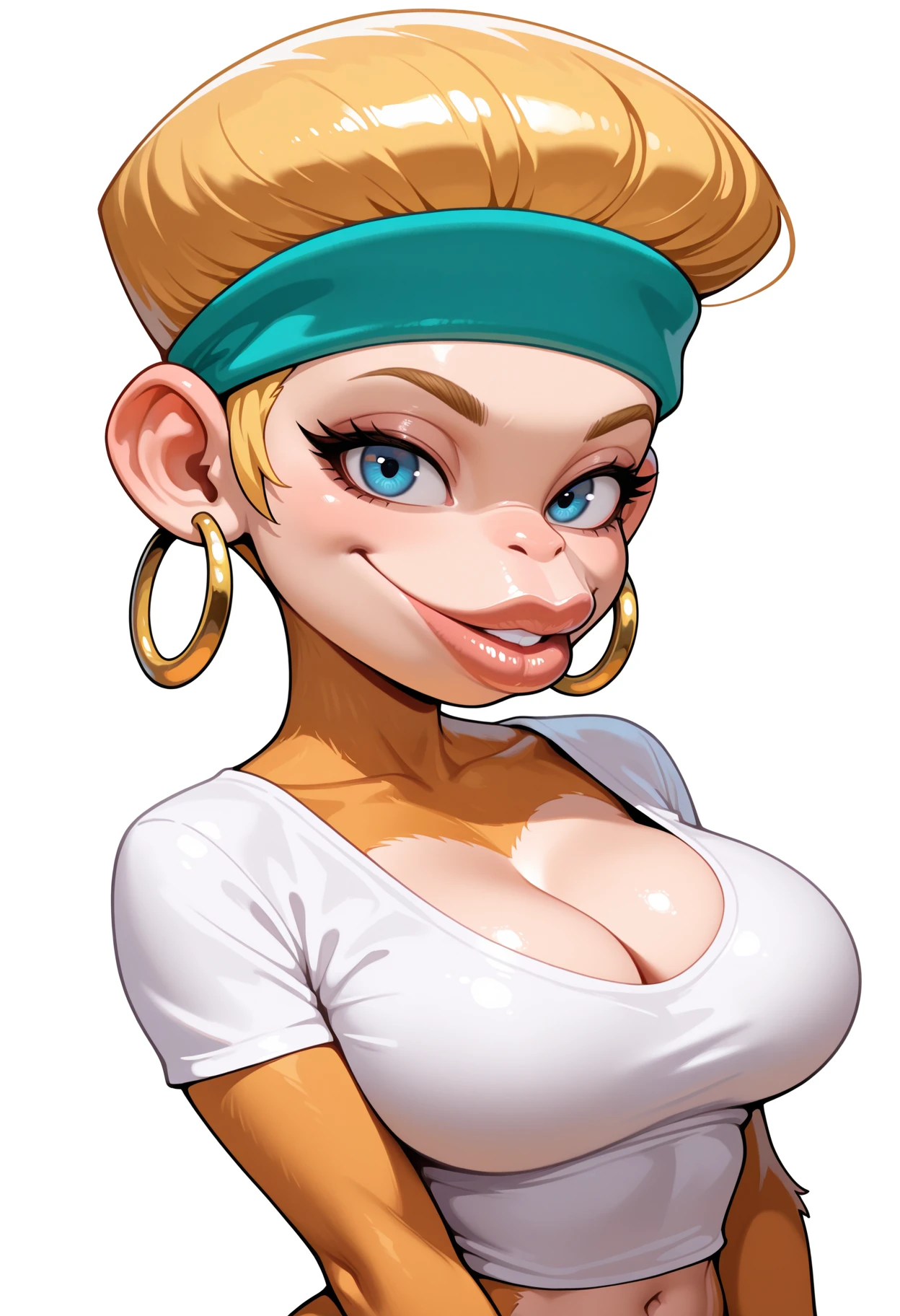 1girl, candykong, blonde hair, blue eyes,headband, short hair, furry, hoop earrings