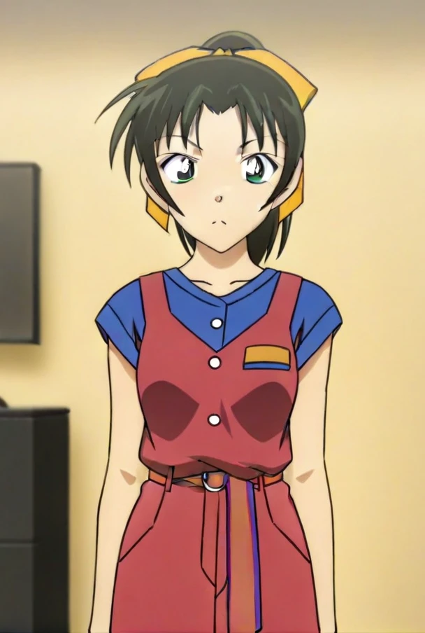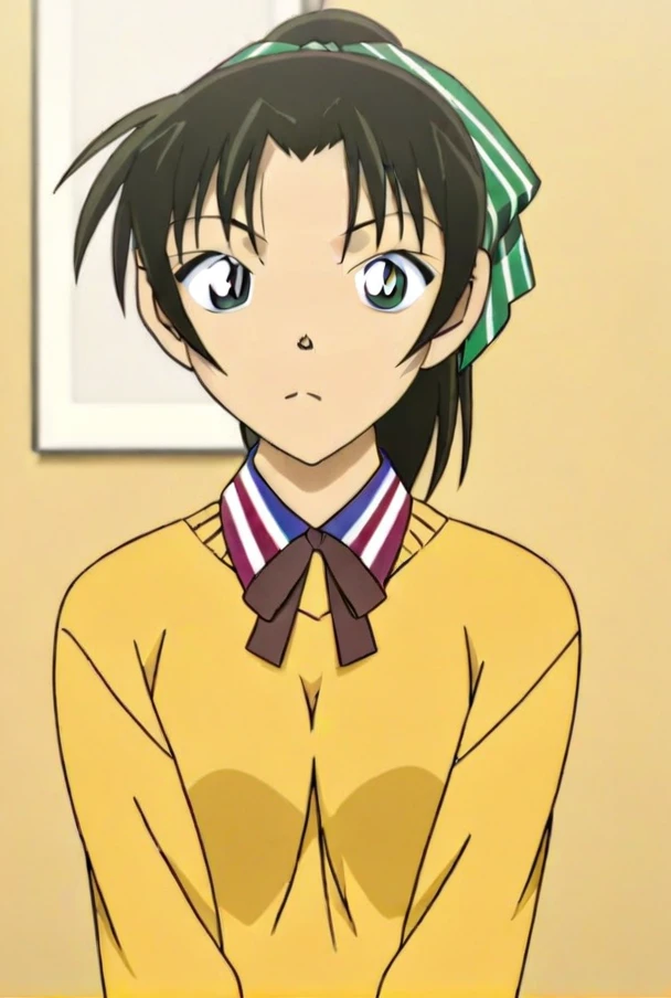 Anime Coloring<lora:Tooyama Kazuha - detective conan V1:0.8>1girl,black hair, green eyes plaid ribbon, ponytail, Tooyama Kazuha