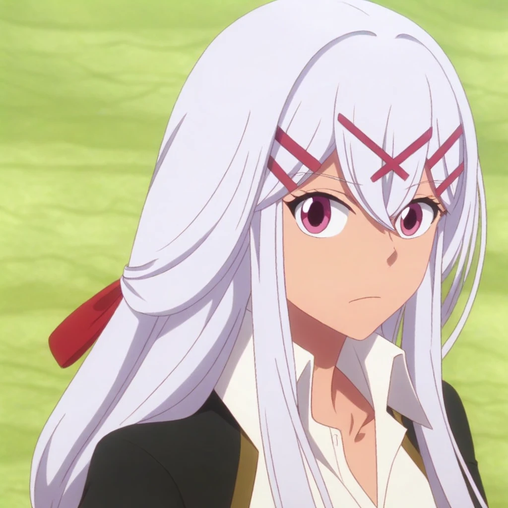 Yulicia, pink magenta eyes, silver white hair, long hair, very long hair, low-tied long hair, hair ornament, hair between eyes, hairclip, x hair ornament, 1girl, solo