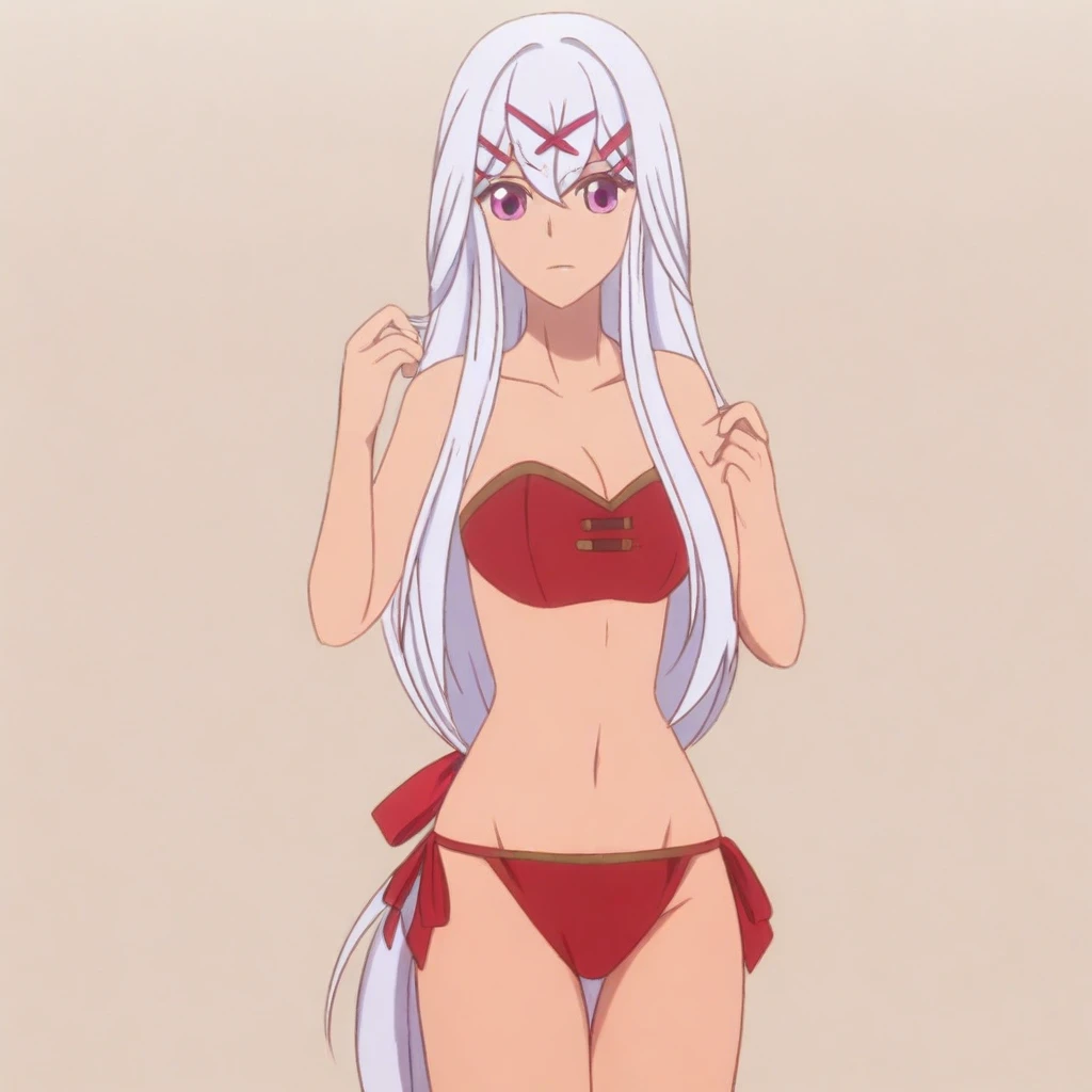 • Yulicia, pink magenta eyes, silver white hair, long hair, very long hair, low-tied long hair, hair ornament, hair between eyes, hairclip, x hair ornament, 1girl, solo, breasts, red bikini, cleavage, side-tie bikini bottom, ribbon