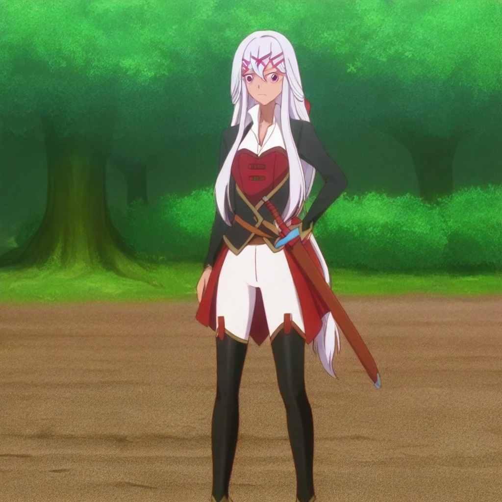 • Yulicia, pink magenta eyes, silver white hair, long hair, very long hair, low-tied long hair, hair ornament, hair between eyes, hairclip, x hair ornament, 1girl, solo, thighhighs, sheath, outdoors, hand on own hip, pants, tree, white pants, standing, sheathed