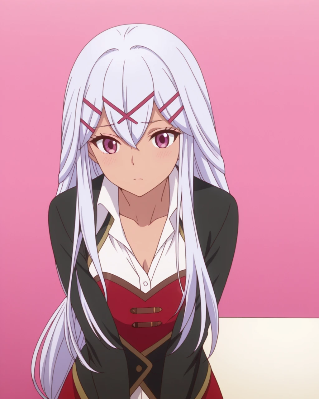 • Yulicia, pink magenta eyes, silver white hair, long hair, very long hair, low-tied long hair, hair ornament, hair between eyes, hairclip, x hair ornament, 1girl, solo, looking at viewer, upper body, shirt, white shirt, collarbone,closed mouth, anime coloring