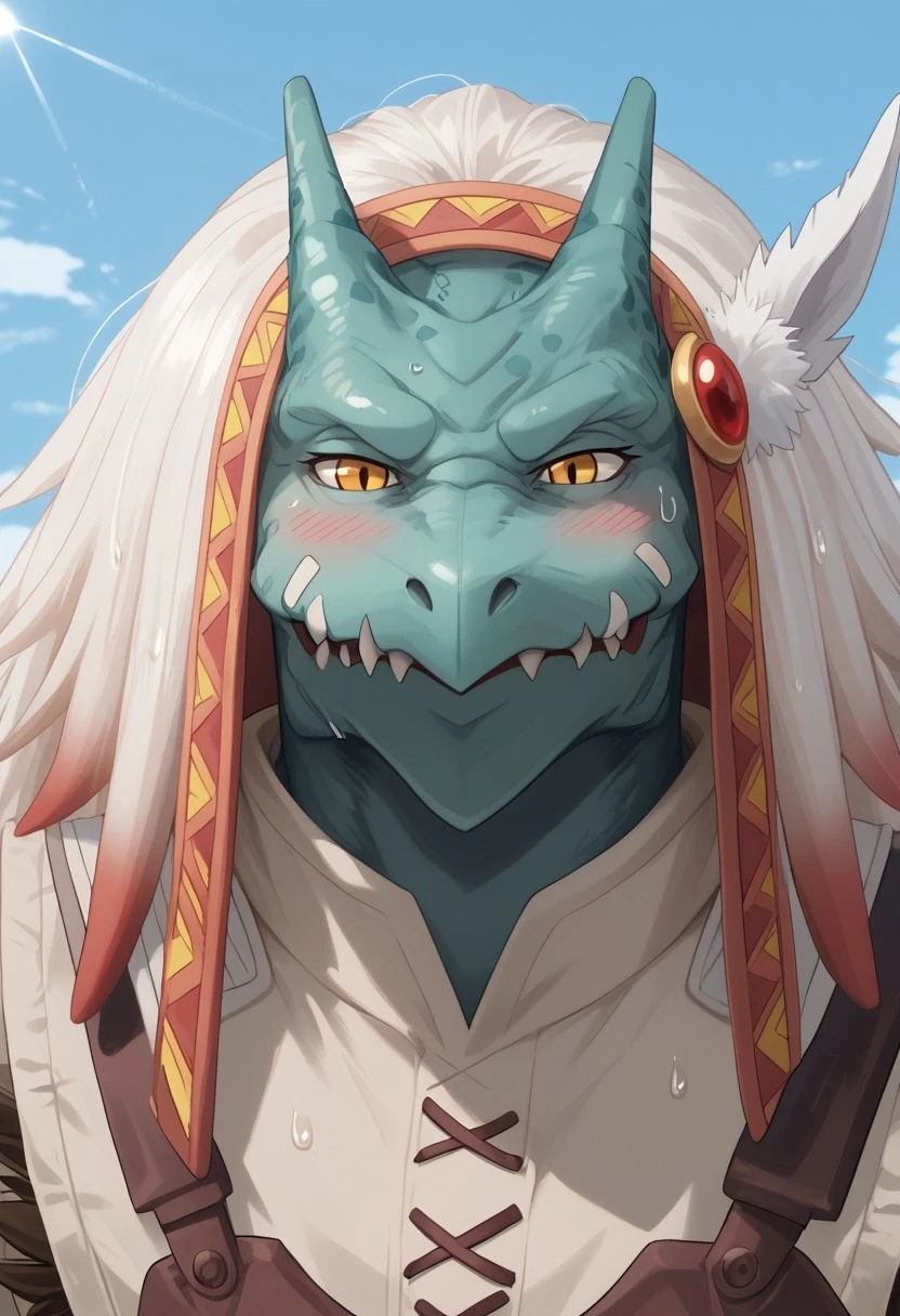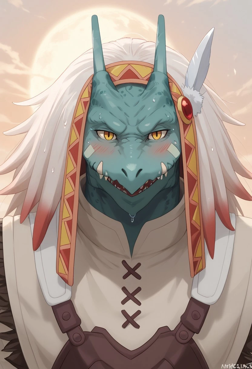 dragon-like creature, blue-green scales, sharp golden eyes, no visible eyebrows, muscular build, strong jawline, long horns, small fangs, angular face, ridged forehead, smooth and reptilian skin texture, feathered white and red headdress, tribal patterns, beige tunic, brown shoulder coverings, red and yellow decorative accents, crisscross chest lacing, layered chest armor with purple tones, ornate design