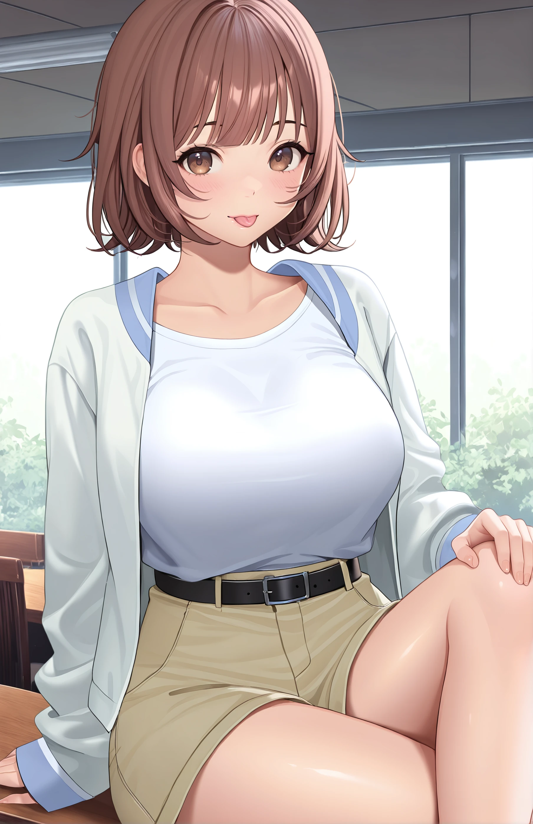 KatouUi, breasts, short hair, bangs, large breasts, brown hair, shirt, long sleeves, brown eyes, collarbone, white jacket, white shirt, , shorts, belt, black belt, shirt tucked in