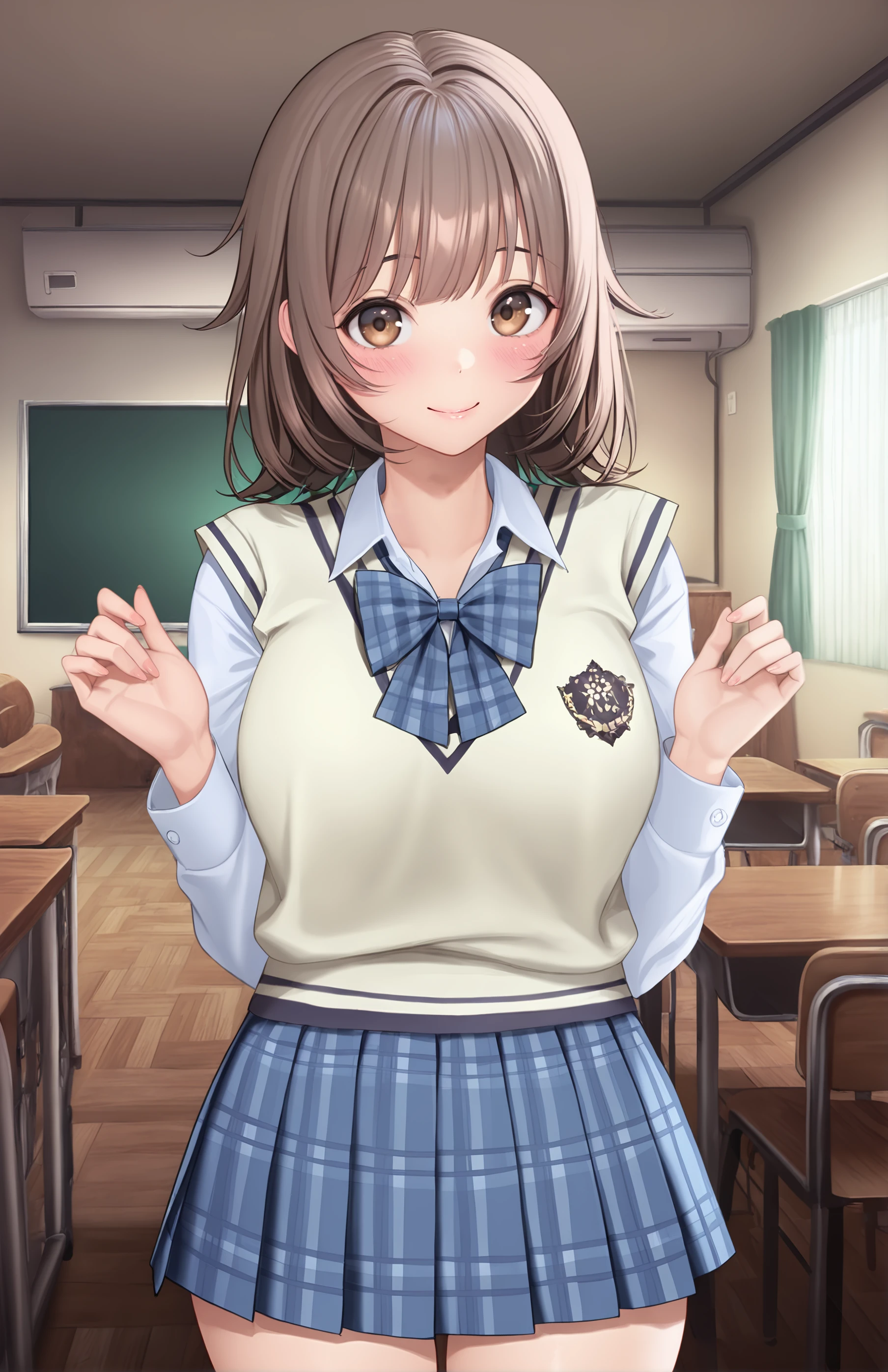 KatouUi, breasts, short hair, bangs, skirt, brown hair, shirt, long sleeves, bow, brown eyes, school uniform, white shirt, pleated skirt, collared shirt, indoors, bowtie, medium hair, blue skirt, plaid, blue bow, plaid skirt, sweater vest, plaid bow