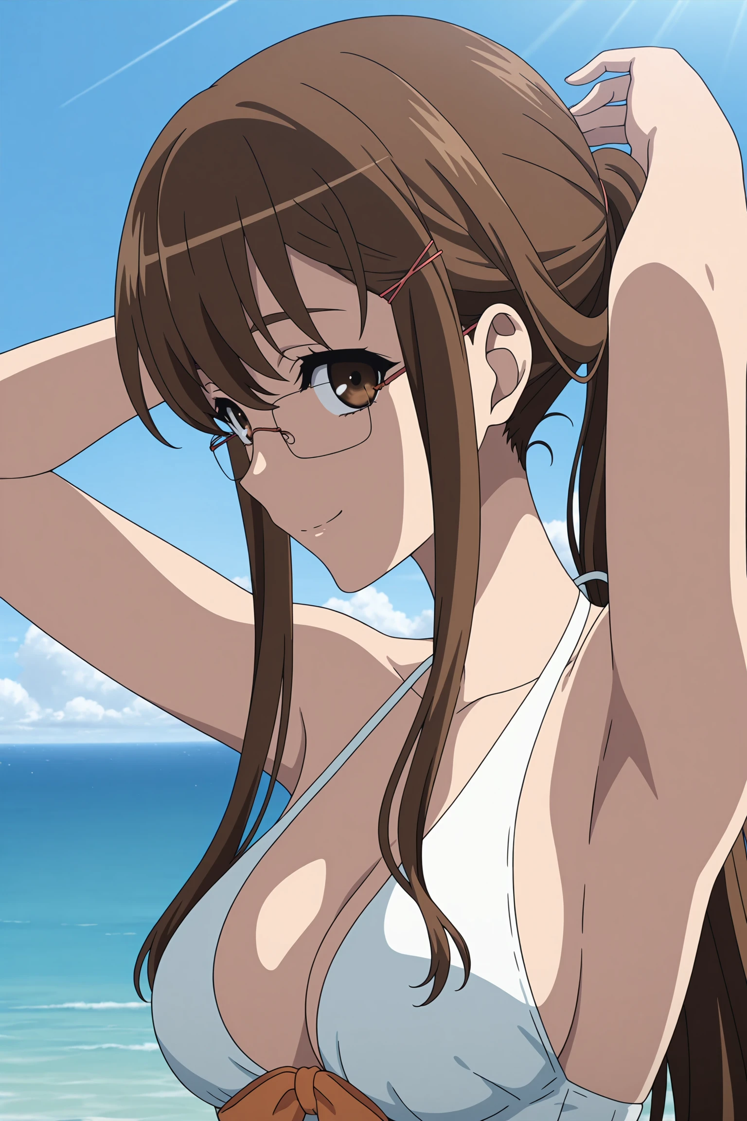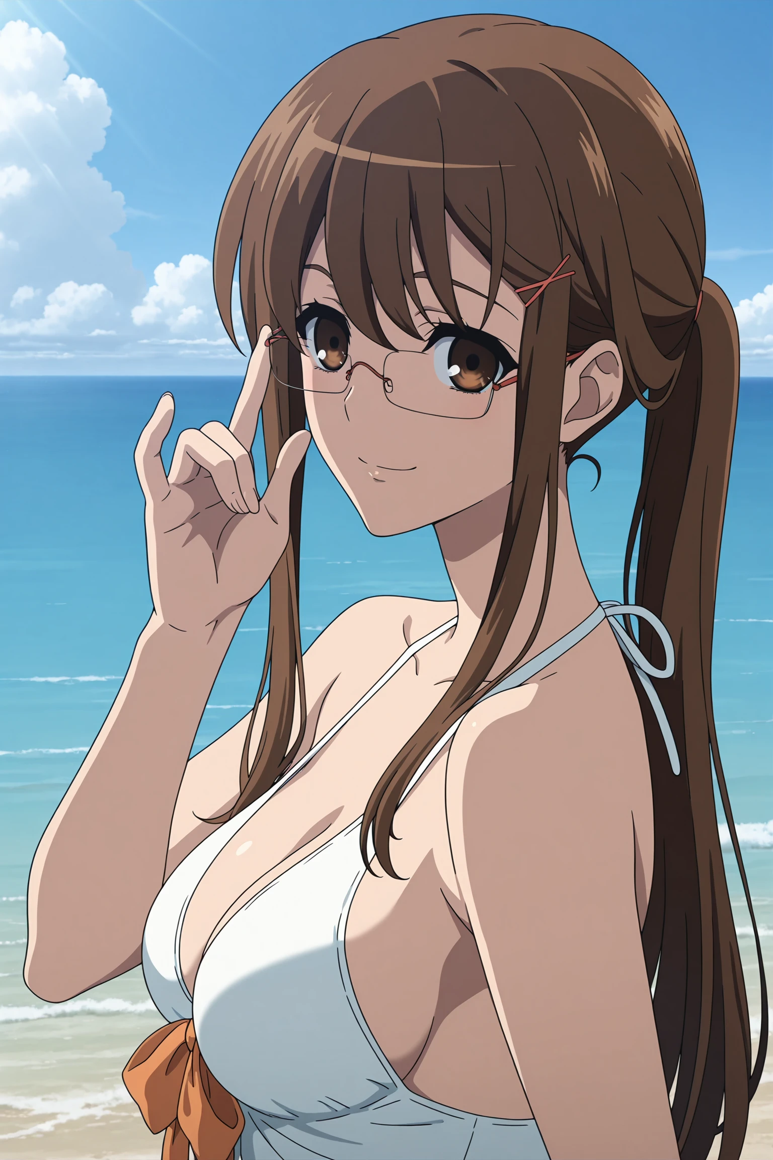 mikami reiko, long hair, brown hair, ponytail, pink hair tie, pink hair pin, sidelocks, brown eyes, glasses, white swimsuit, one-piece swimsuit, orange bow, ribbon-trimmed swimsuitDescription