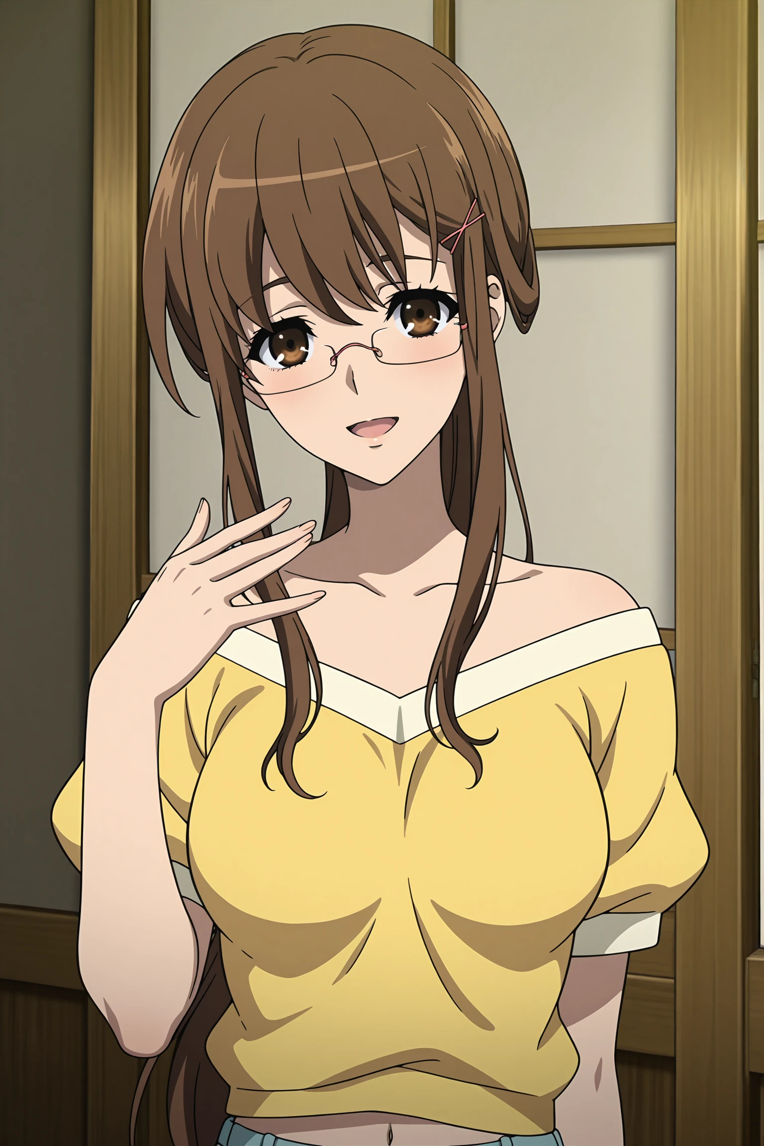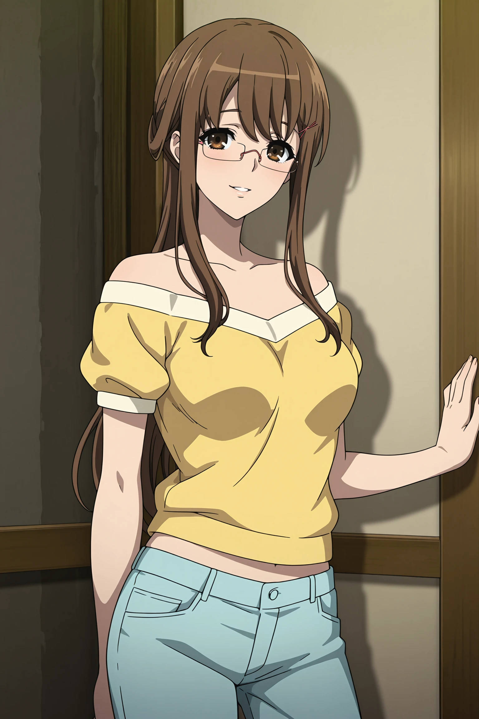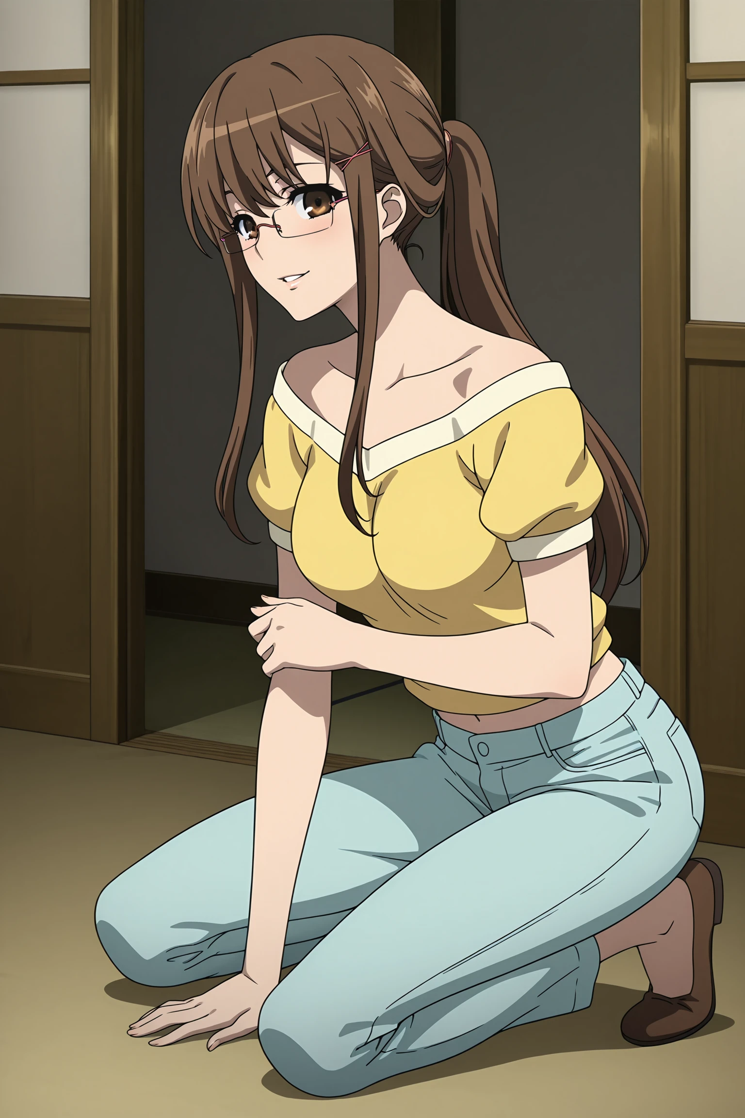 mikami reiko, long hair, brown hair, ponytail, pink hair tie, pink hair pin, sidelocks, brown eyes, pink-framed eyewear, rimless eyewear, yellow shirt, short sleeves, puffy sleeves, collarbone, bare shoulder, strapless, blue pants, brown footwear, flats