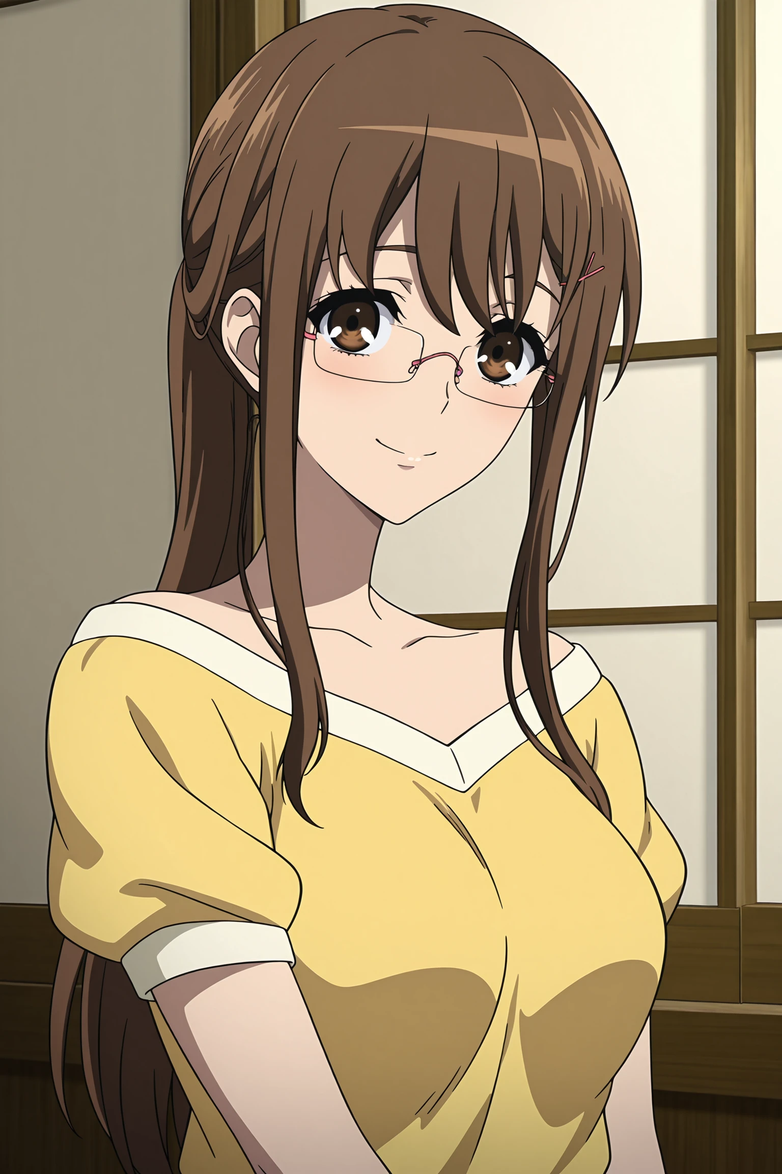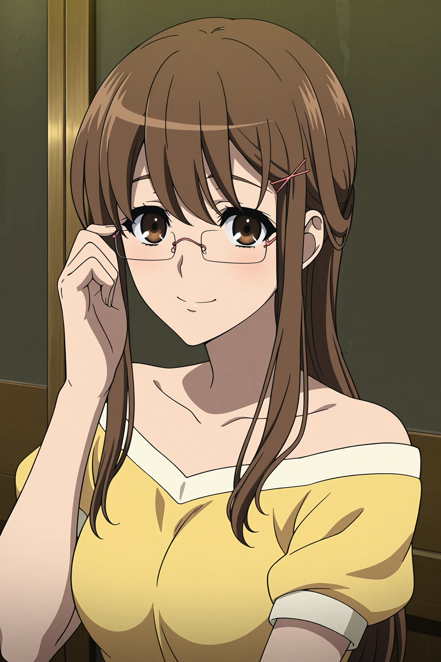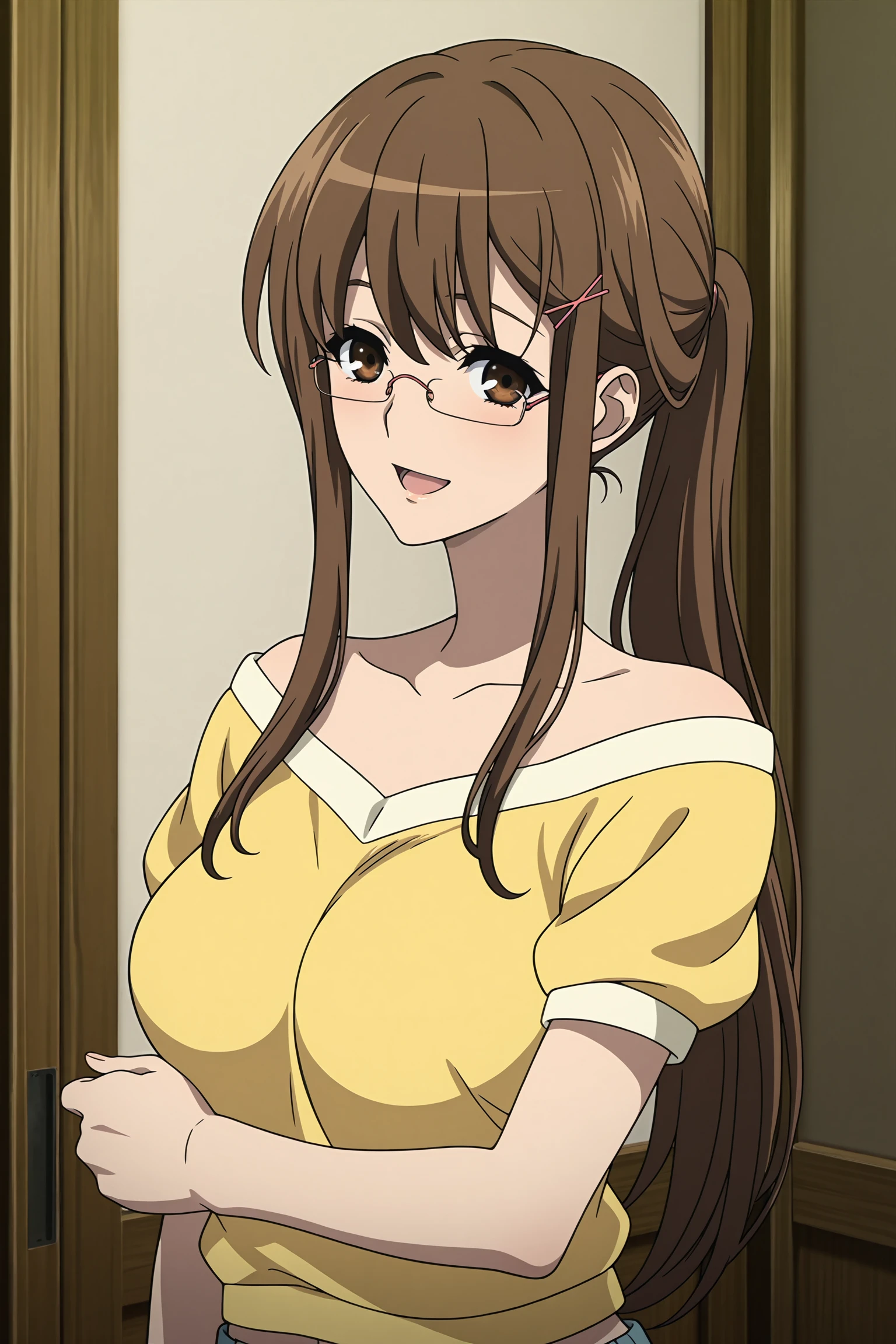 mikami reiko, long hair, brown hair, ponytail, pink hair tie, pink hair pin, sidelocks, brown eyes, pink-framed eyewear, rimless eyewear, yellow shirt, short sleeves, puffy sleeves, collarbone, bare shoulder, strapless, blue pants, brown footwear, flats