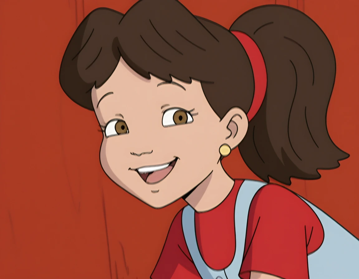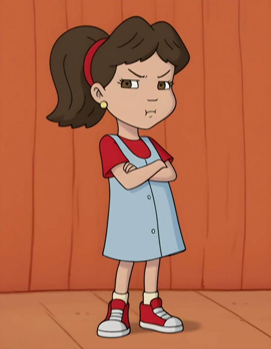 emdt1,1girl, solo, brown eyes, brown hair, ponytail, brown eyes,  jewelry, earrings, red hairband, blue dress, red shirt, short sleeves, red sneakers, socks, parody,<lora:emmdt-000011:1>