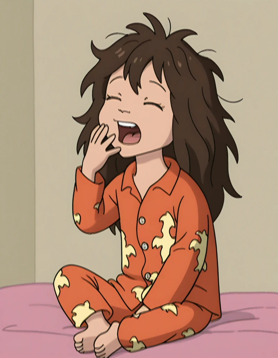 emdt1,1girl, solo, brown hair, long hair, messy hair, brown eyes, orange pajamas, barefoot, parody,<lora:emmdt-000011:1>