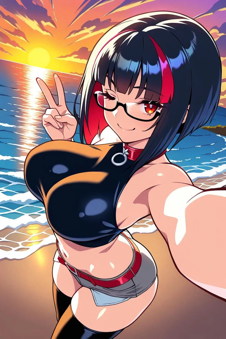 Appearance: rignettasan, short hair, bangs, bob cut, blunt bangs, black hair, red hair, multicolored hair, two-tone hair, streaked hair, red eyes, glasses, black-framed eyewear, semi-rimless eyewear, large breasts
