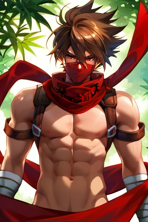 Tags: Strider_Hiryu, solo, brown hair, red eyes, 1boy, male focus, scarf, mask, bandages, armband, red scarf, ninja, blue shirt, blue pants.