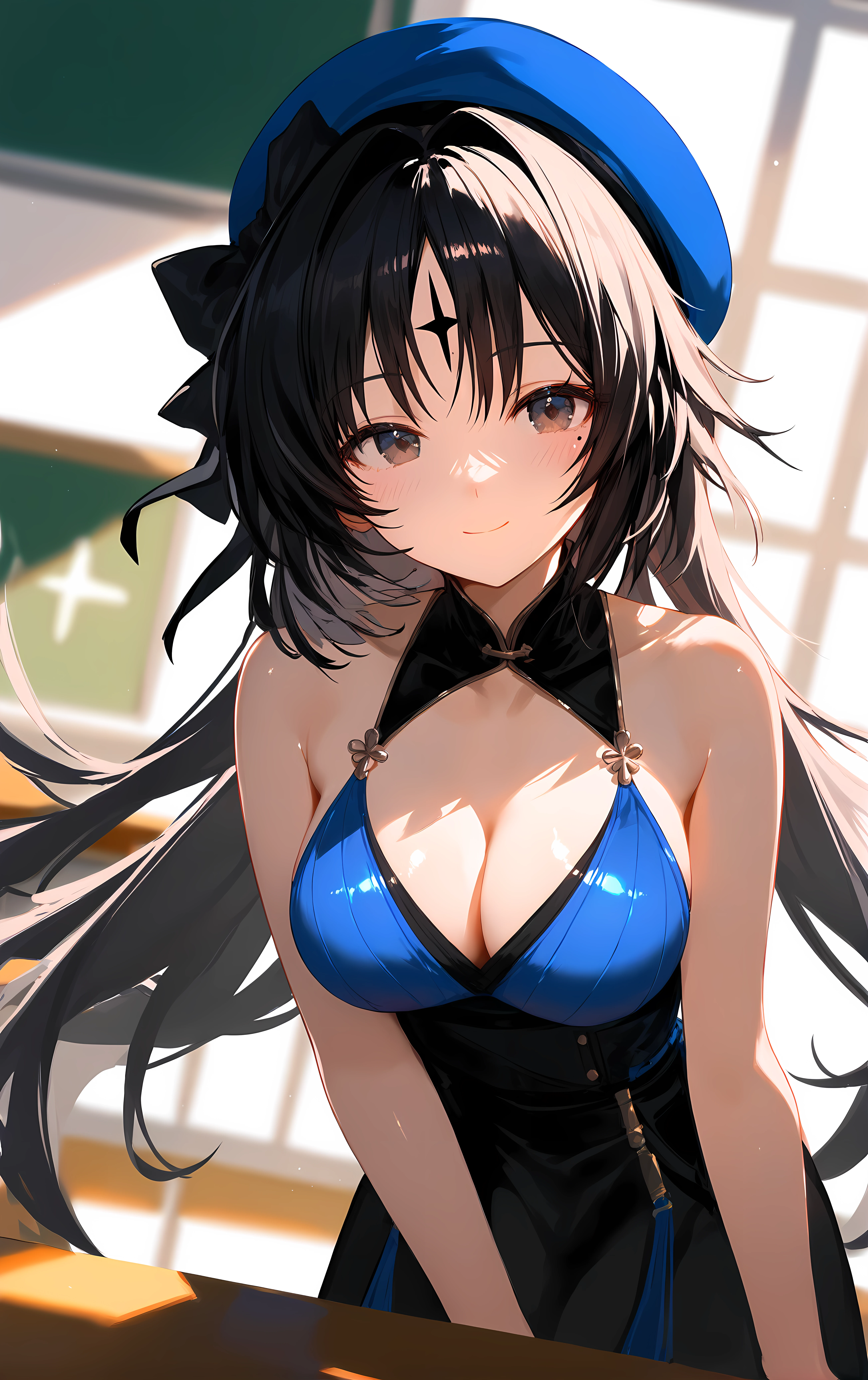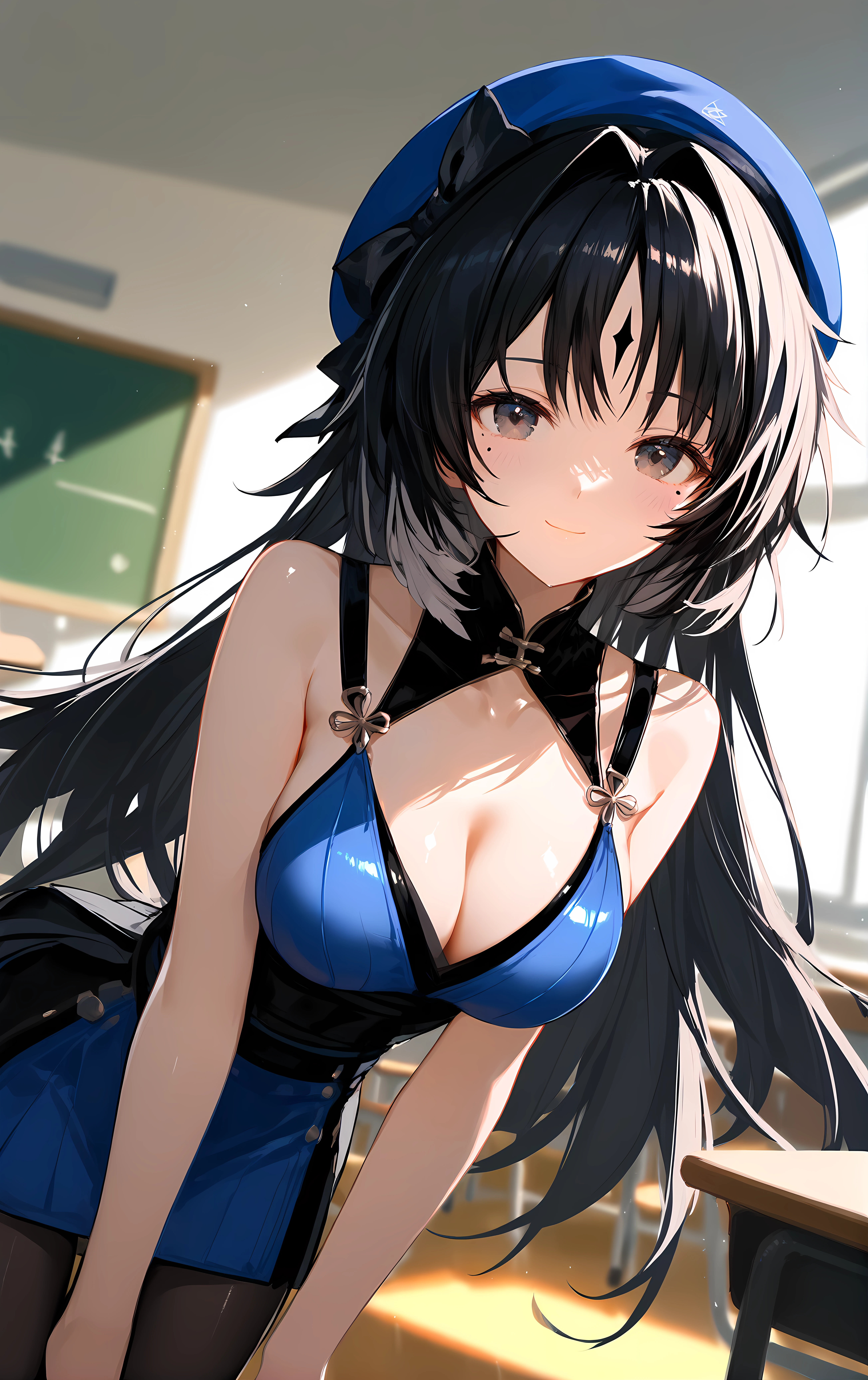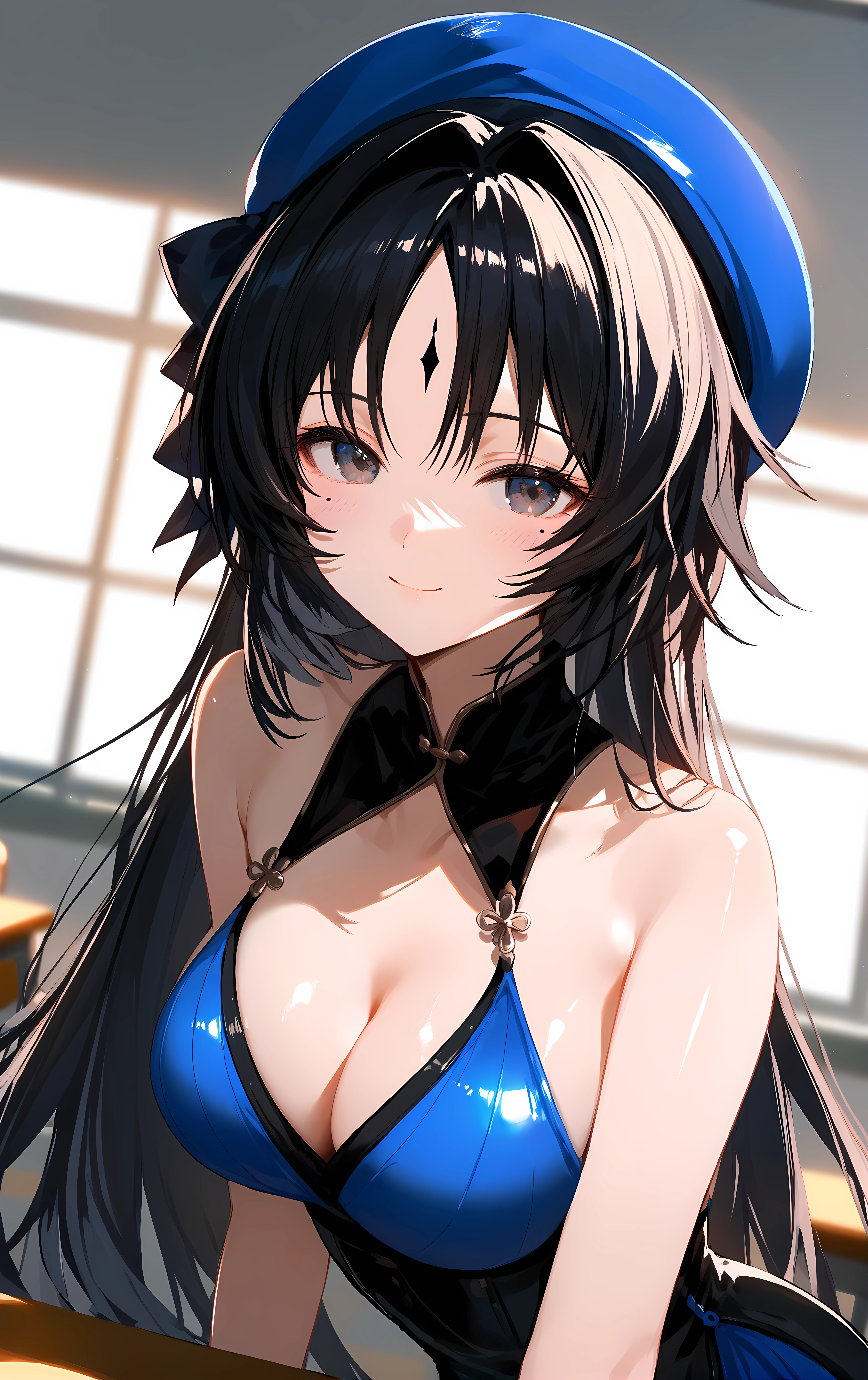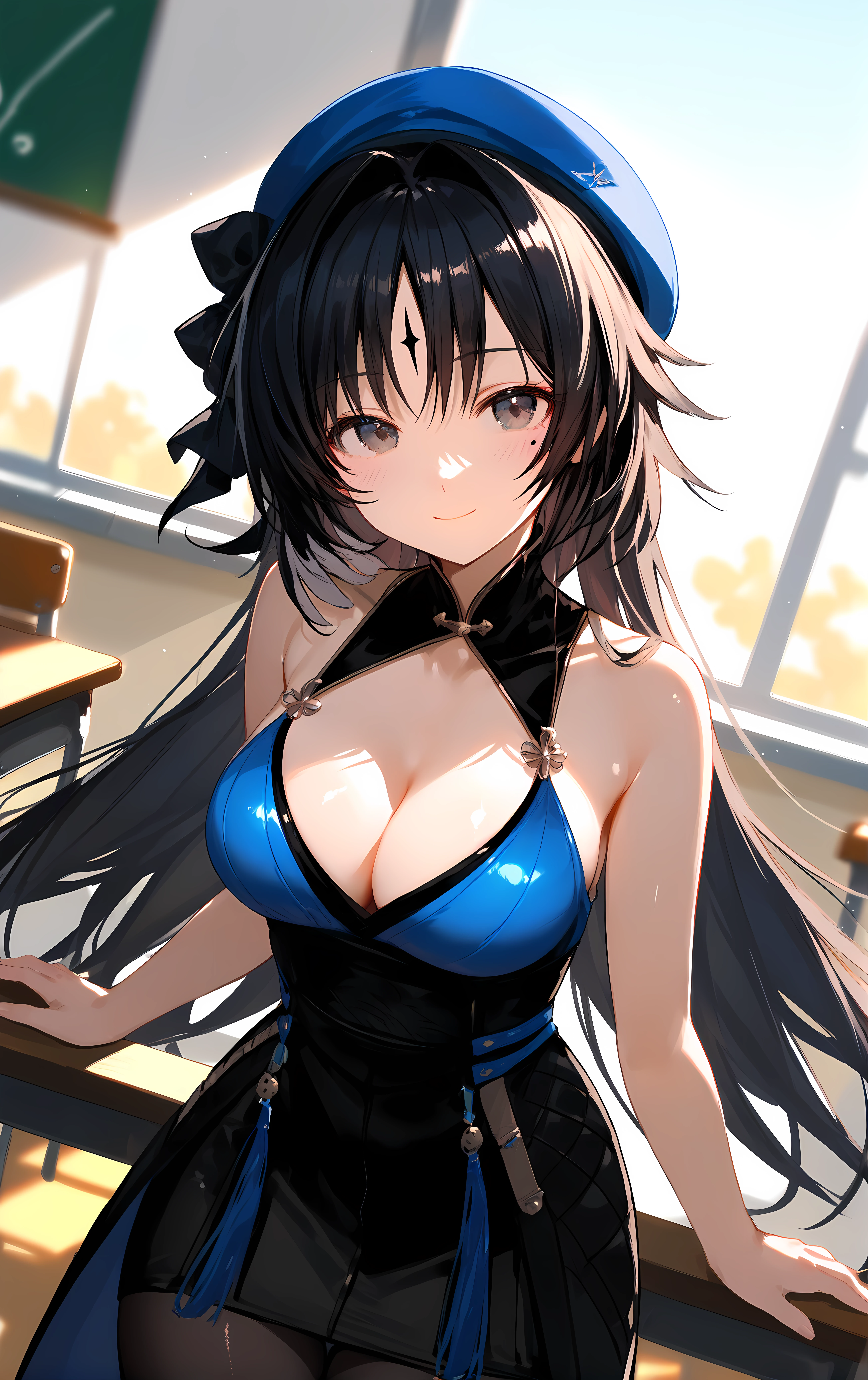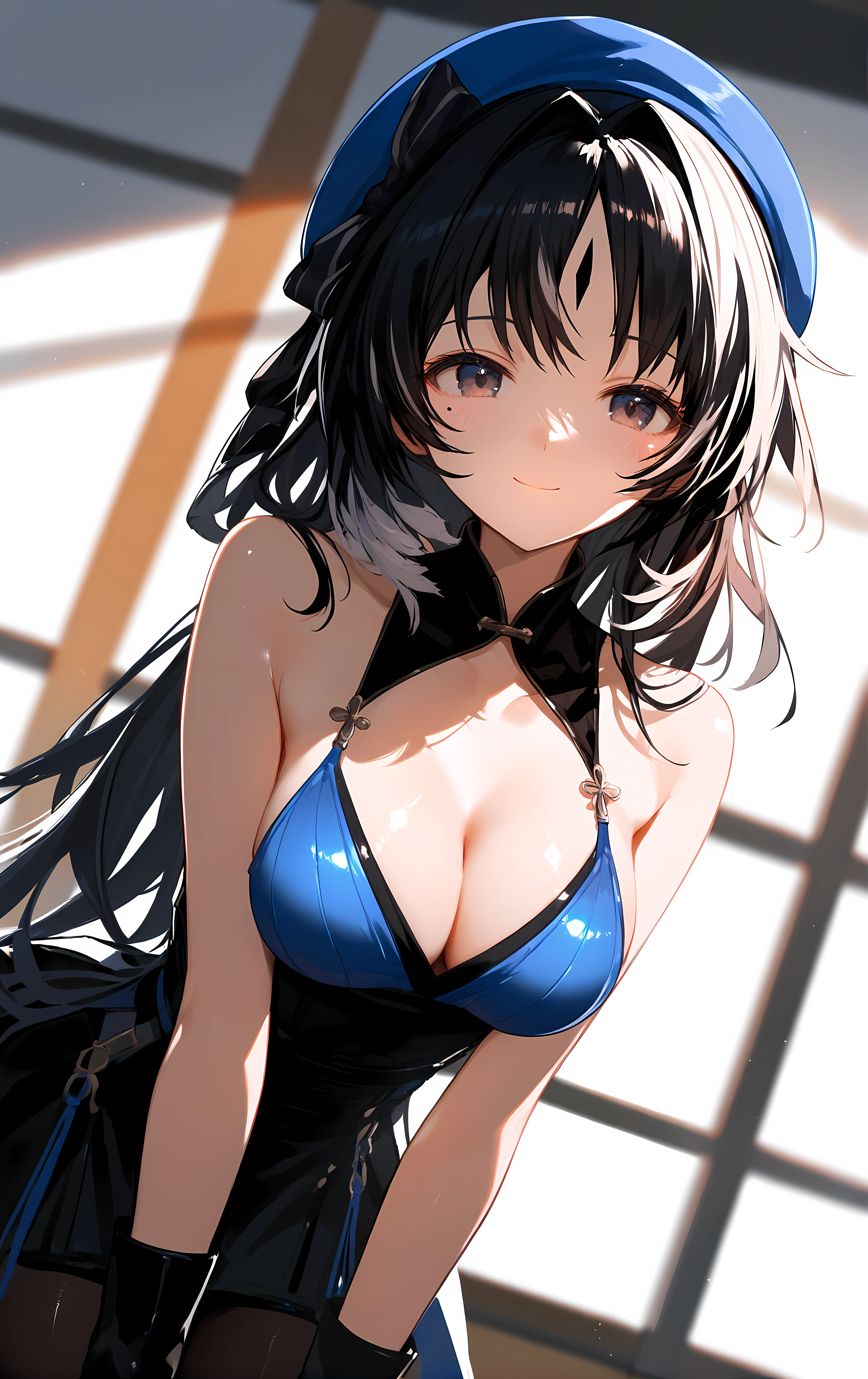 yang, 1girl, breasts, solo, pantyhose, long_hair, black_hair, hat, cleavage, blue_headwear, high_heels, black_footwear, boots, black_pantyhose, bare_shoulders, facial_mark, grey_eyes, medium_breasts, dress, closed_mouth, mole_under_eye, mole, high_heel_boots, bare_arms, sleeveless, beret, very_long_hair, blue_dress,