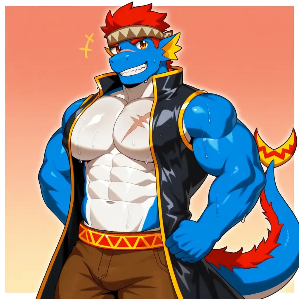 Solo, male, anthro dragon, bara, blue body, white stomach, orange eyes, red hair, yellow-red fin ears, red triangle belt, Brown pants, Brown triangle headband, black zipper coat with gold trim, yellow-red fin tail tip, sleeveless, scar on half nose, shirtless, hornless